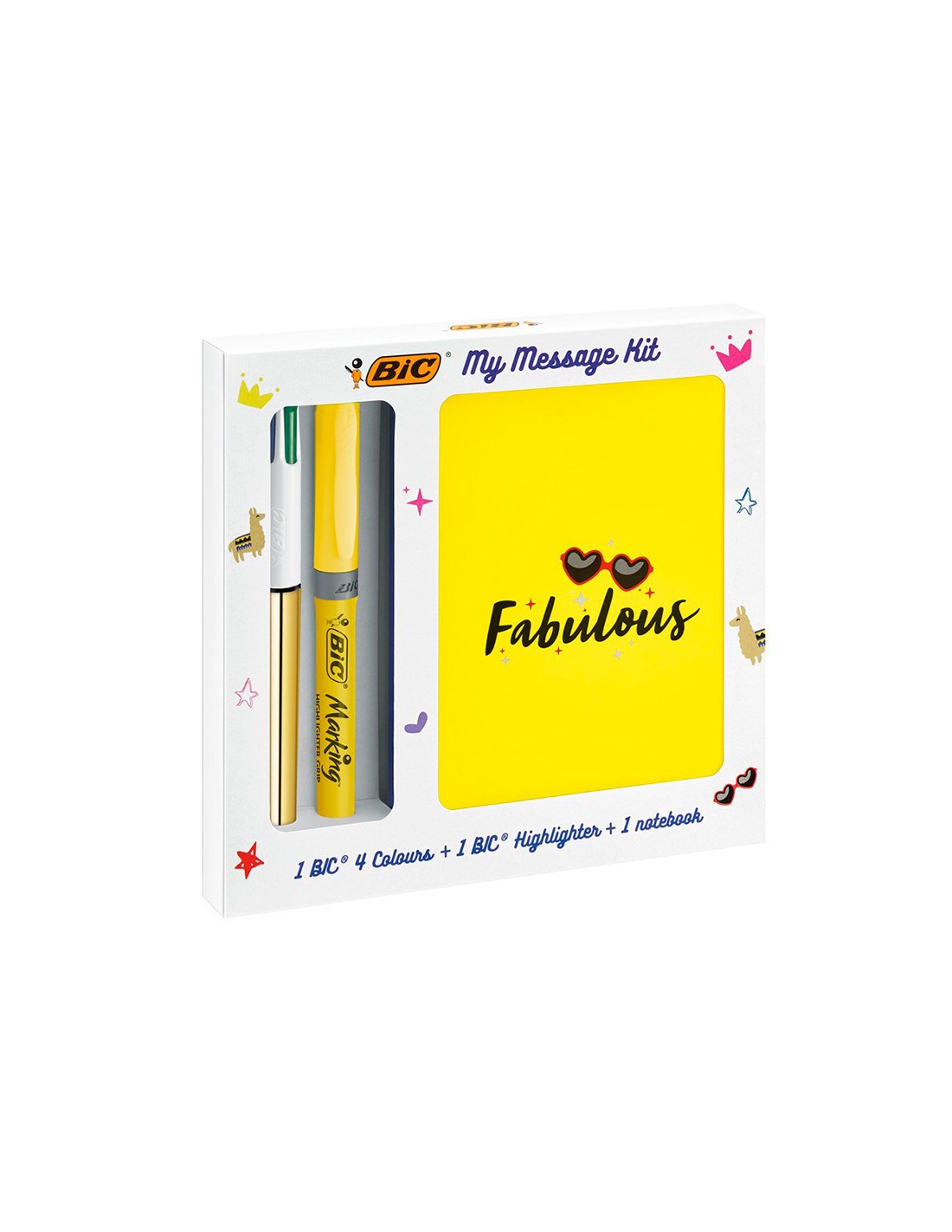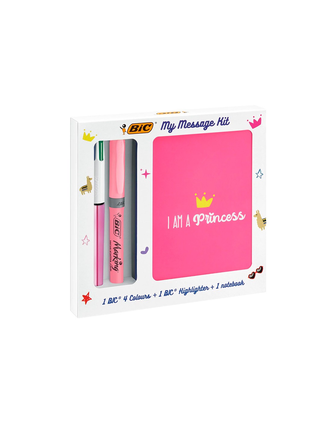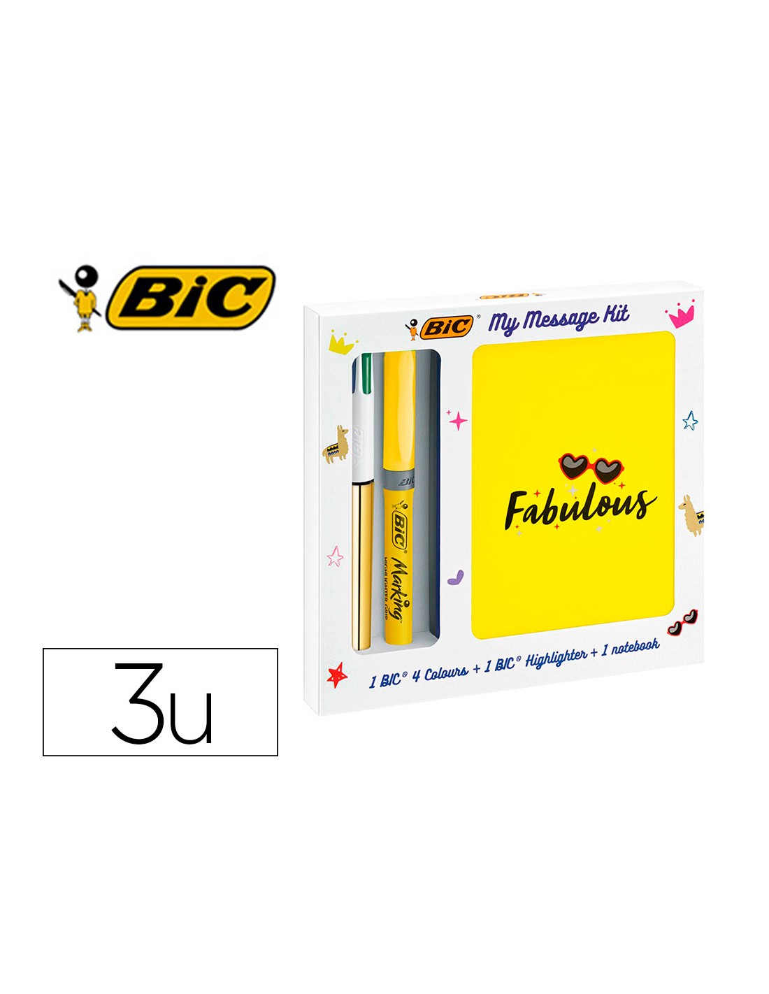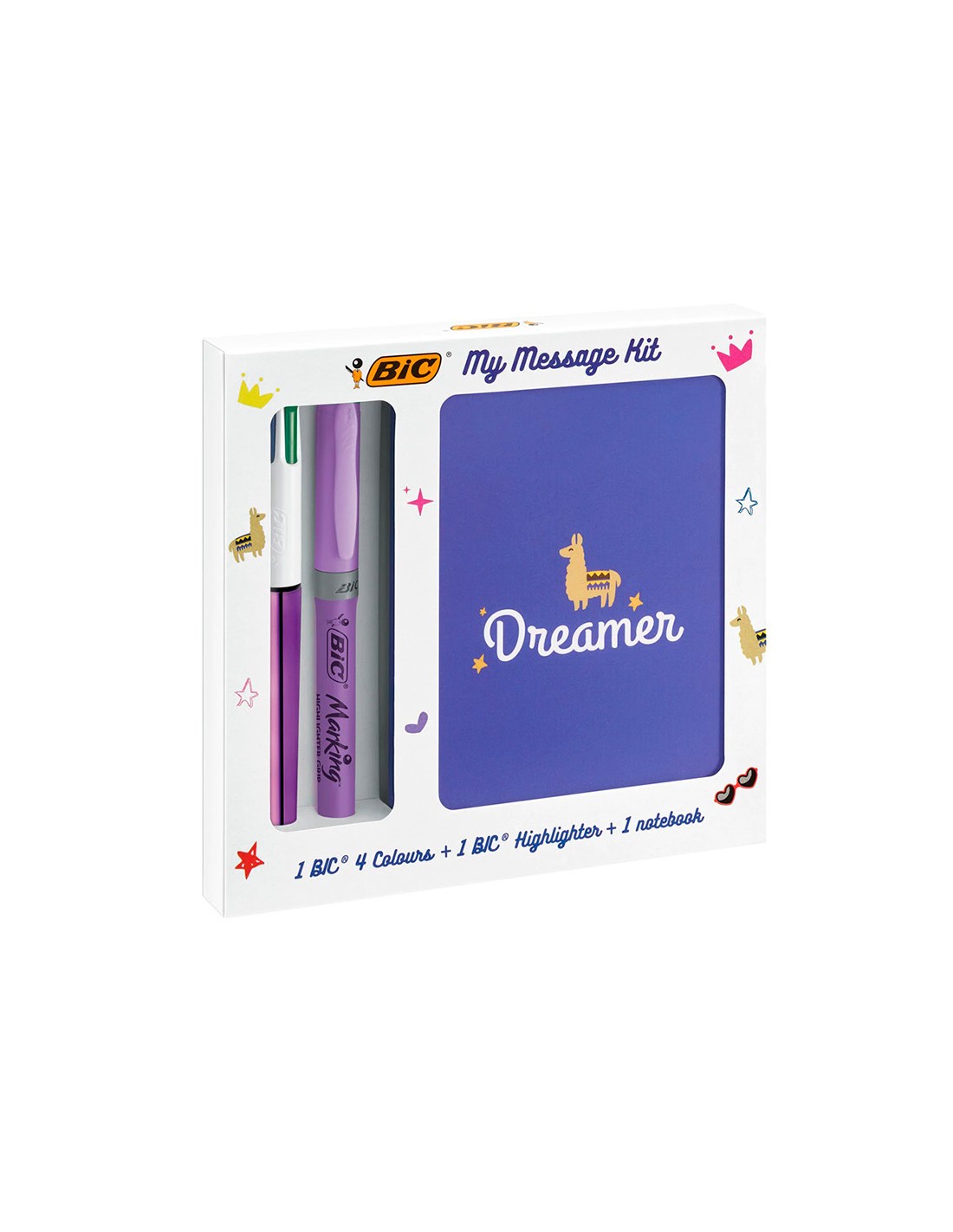 Desata tu creatividad con una de las 3 versiones de este BIC My Message Kit. Se envían surtidas. Un moderno conjunto de bolígrafo y marcador con libreta para mostrar a todo el mundo tu actitud positiva y el estilo de tu escritura. Este kit incluye un bolígrafo BIC 4 Colores Shine con 4 puntas medias de 1 mm en azul, rojo, verde y negro, para una escritura colorida. Incluye un marcador BIC Highlighter Grip Pastel con un grip de goma estriadoque ofrece mayor comodidad y una escritura impecable. Y también una libre ta Message de páginas blancas en formato DIN A6 con un mensaje diferente según el kit, para escribir todas tus ideas.