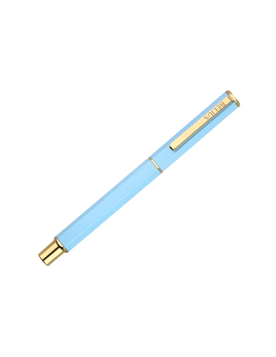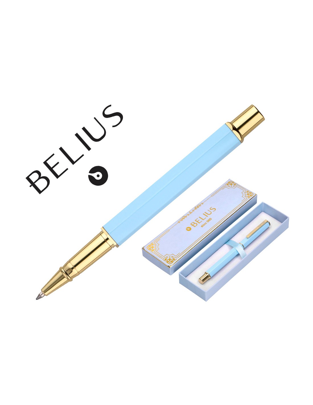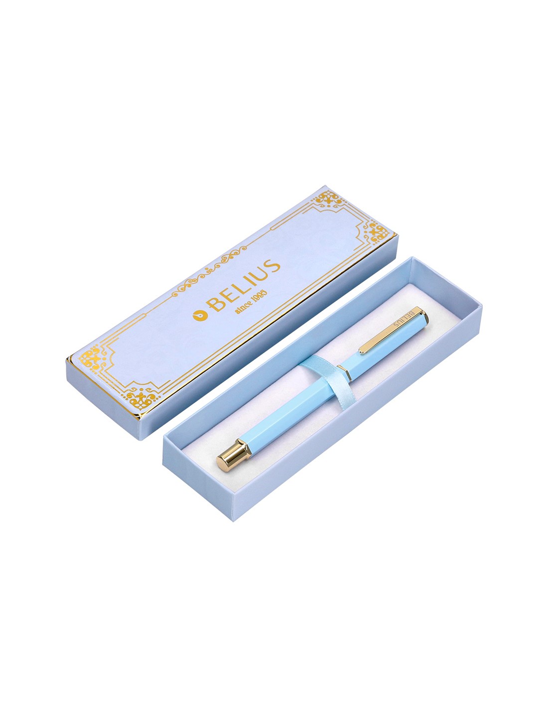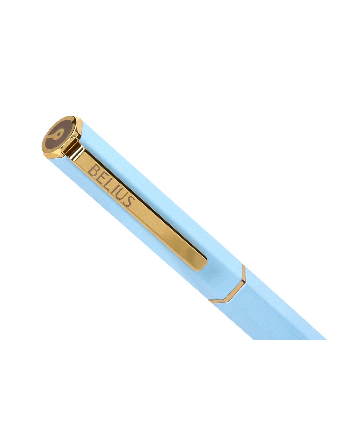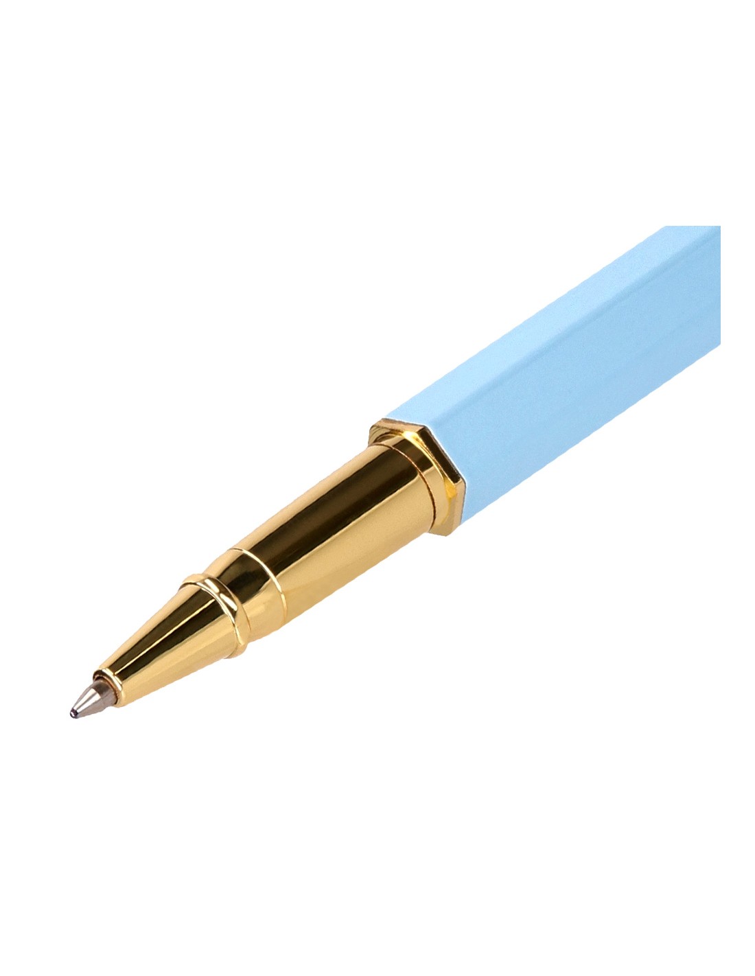 Boligrafo belius macaron bliss forma hexagonal color celeste y dorado tinta azul caja de diseño