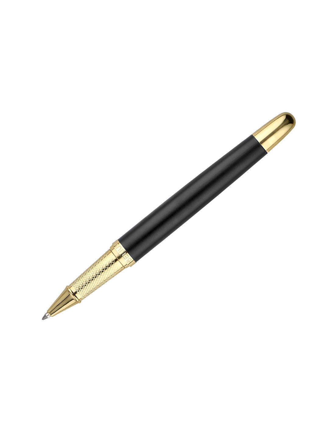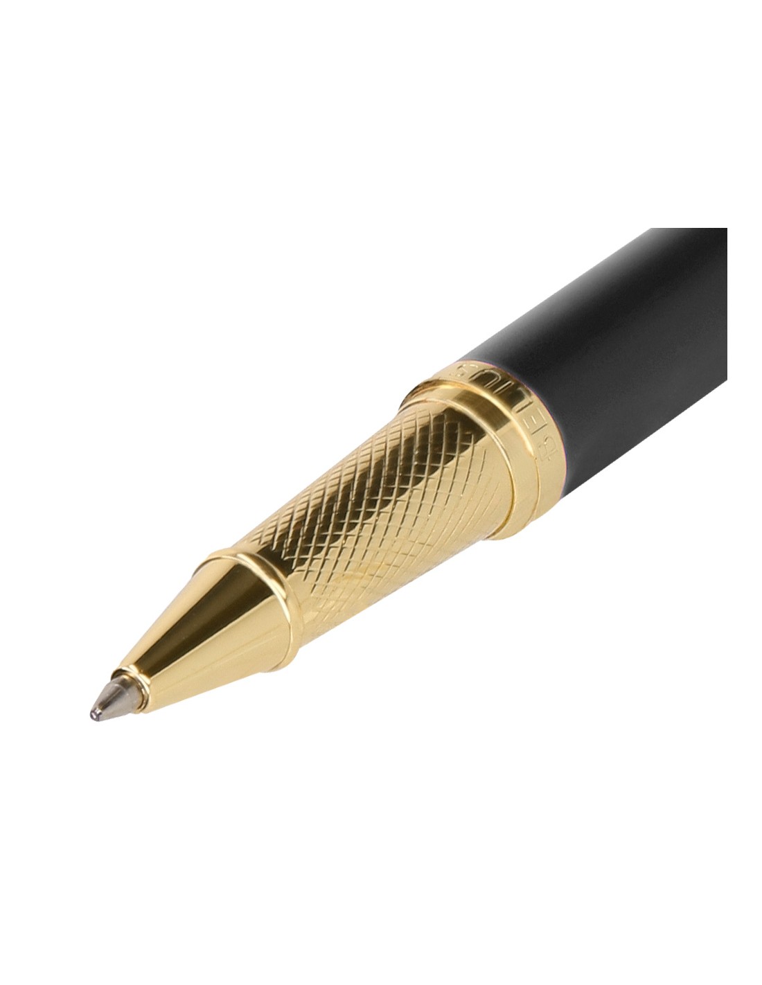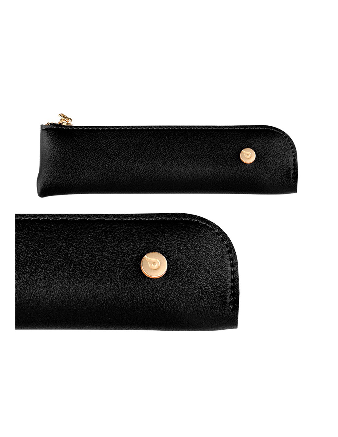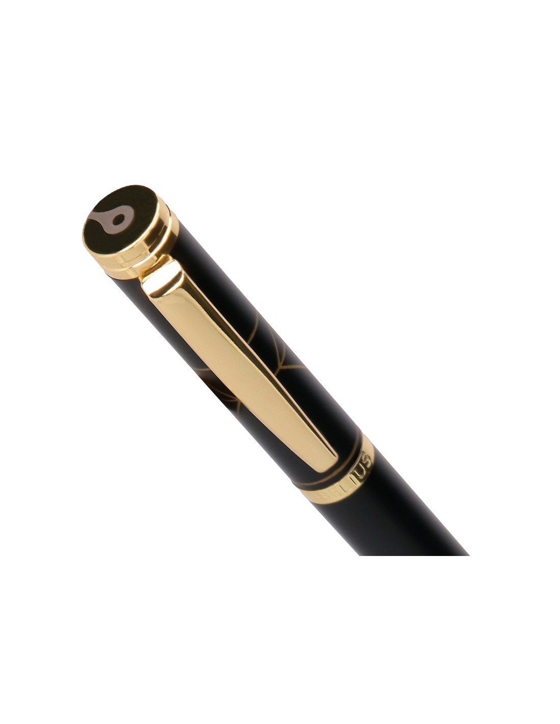 El bolígrafo Soirée es una pieza en color negro con elegantes detalles en dorado, acompañada de un estuche de símilpiel del mismo color, adornado con un refinado detalle metálico dorado. Todo esto está contenido en una elegante caja de cierre magnético, decorada con un diseño Art Deco en dorado. Tanto el diseño de la pieza como el de la caja, hacen un guiño a los años 20 evocando la elegancia clásica del refinado estilo del Art Deco. La colección Soirée te invita a una velada especial, a través de cada pieza, meticulosamente diseñadas para capturar el encanto y el glamour de la época, combinando elementos modernos con un toque clásico y especial. Tinta color azul. Grosor tamaño 0,8 mm.