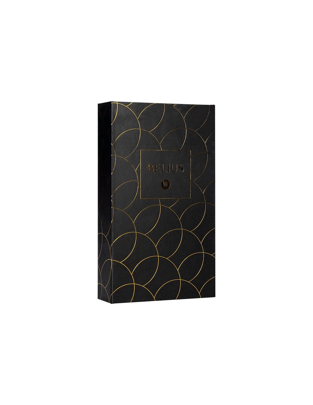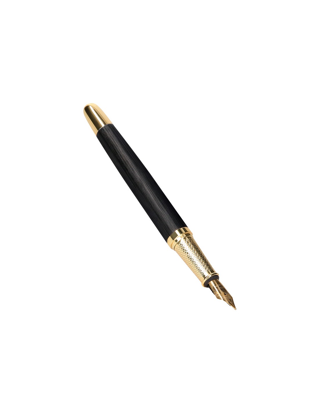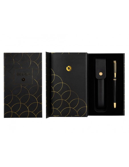 Pluma y estuche cuero belius passion dor aluminio textura cepillada color negro y dorado tinta azul caja diseño