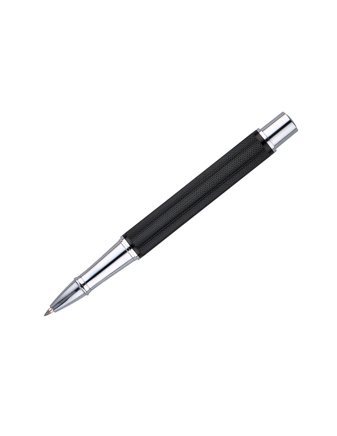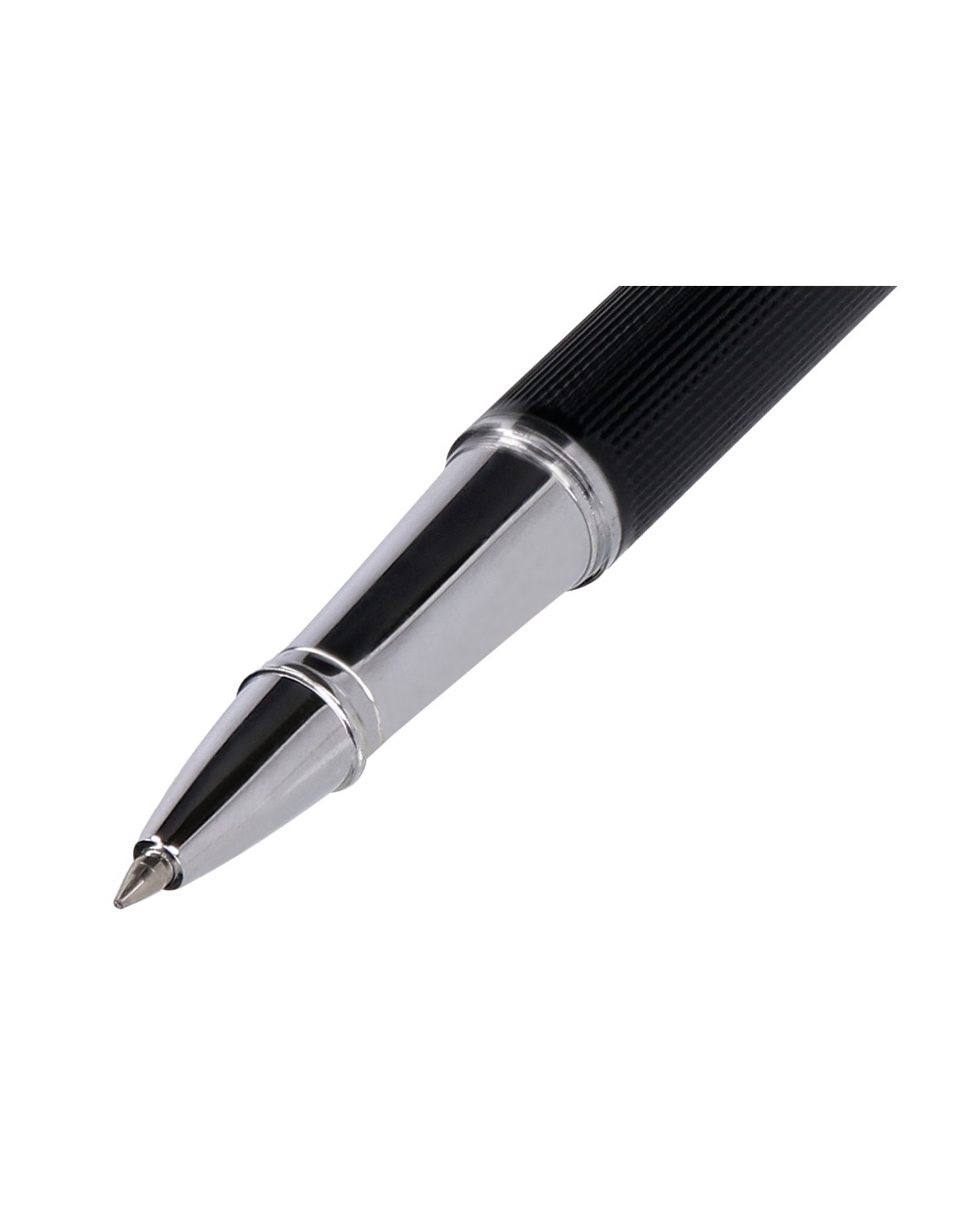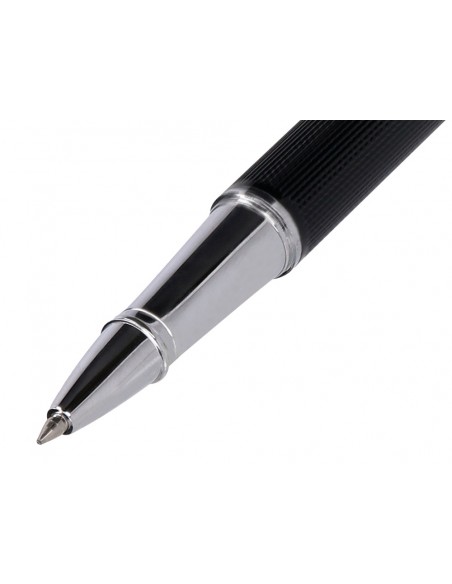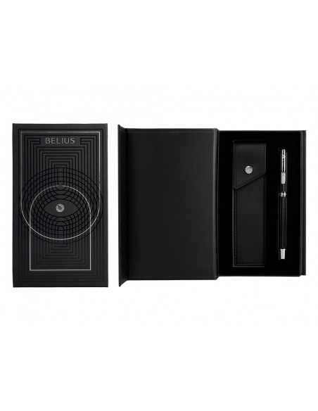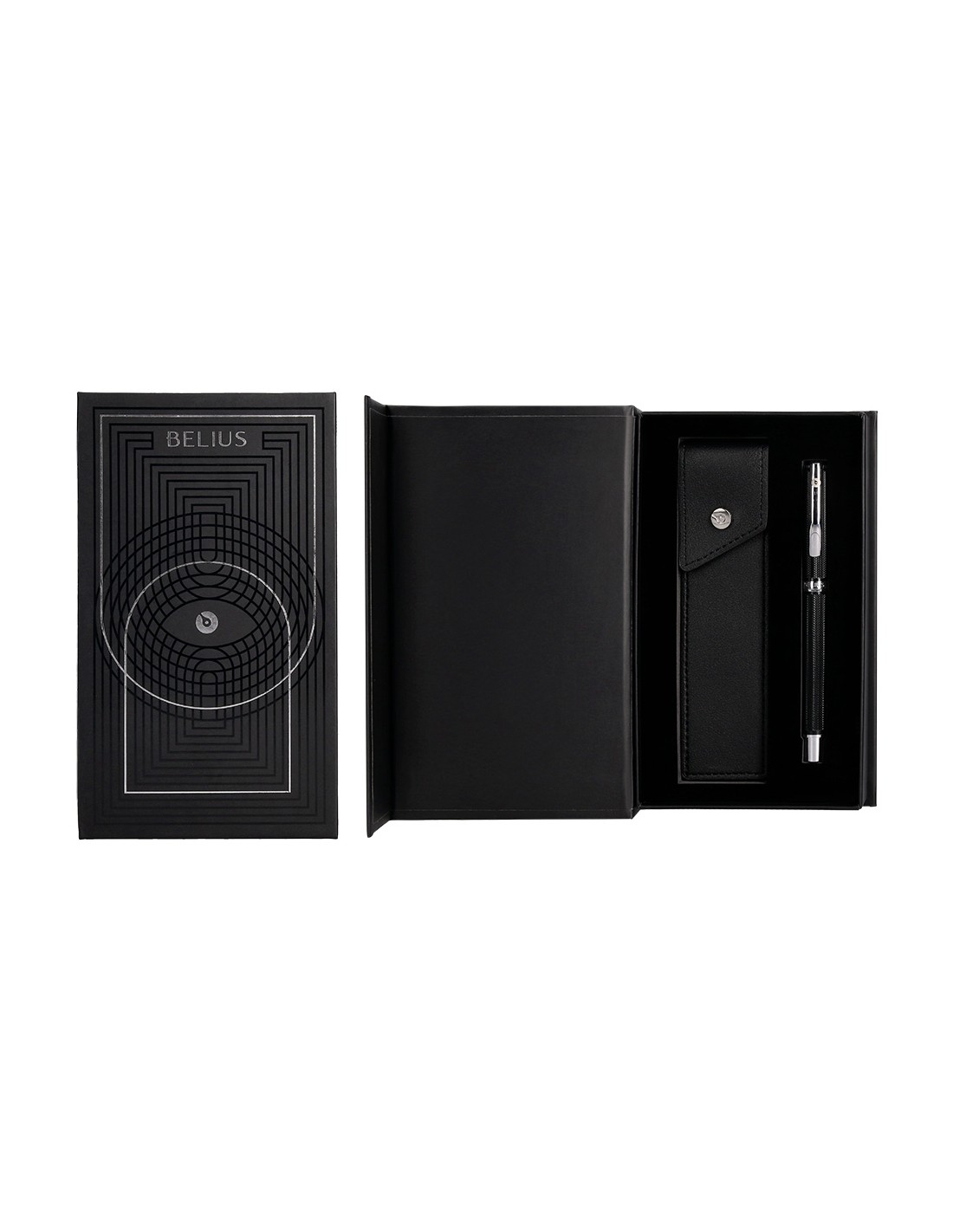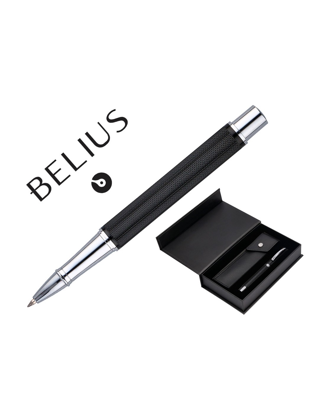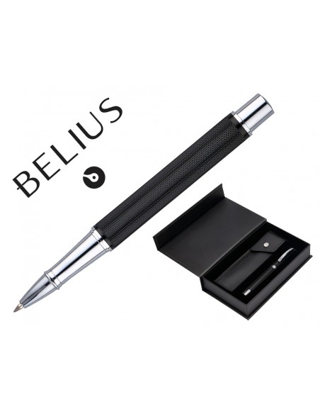Roller y estuche belius turbo aluminio textura punteada negro plateado tinta azul caja de diseño