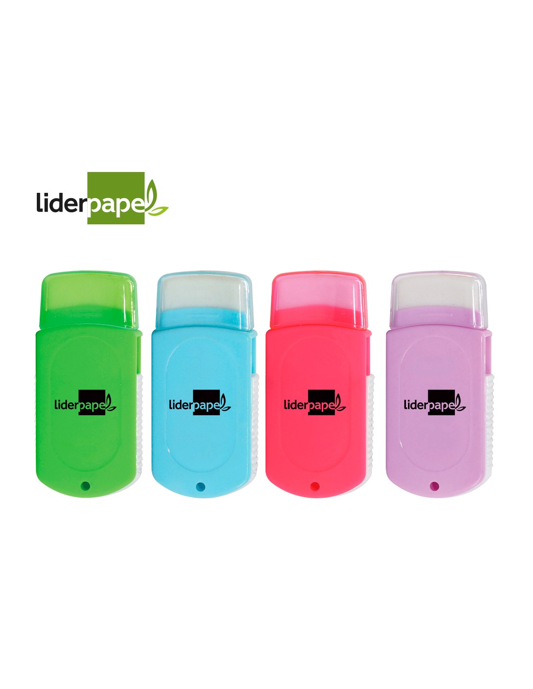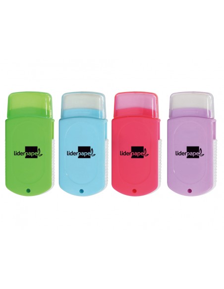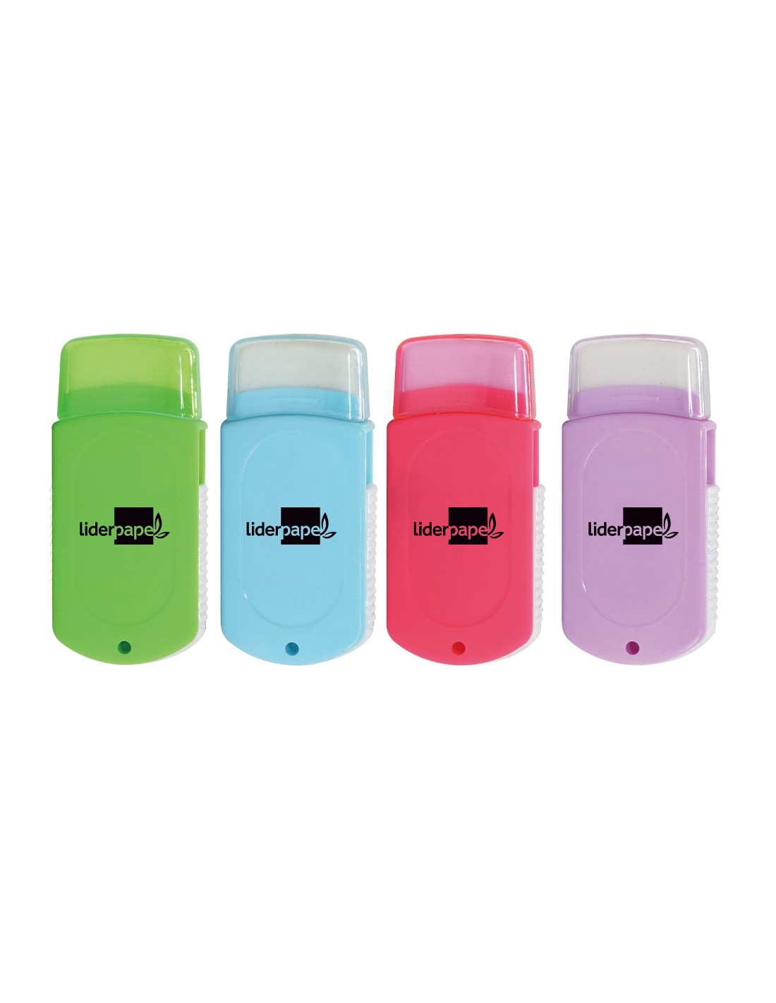 Goma de borrar liderpapel rectangular con protector plastico sacapuntas 2 usos y cepillo colores surtidos
