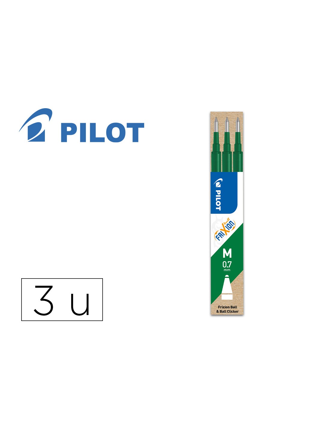 Recambio para bolígrafos Pilot Frixion Ball Clicker. Tres colores disponibles azul, negro y rojo. Punta de 0,7 mm. Trazo de 0,4 mm. El estuche de 3 recambios.
