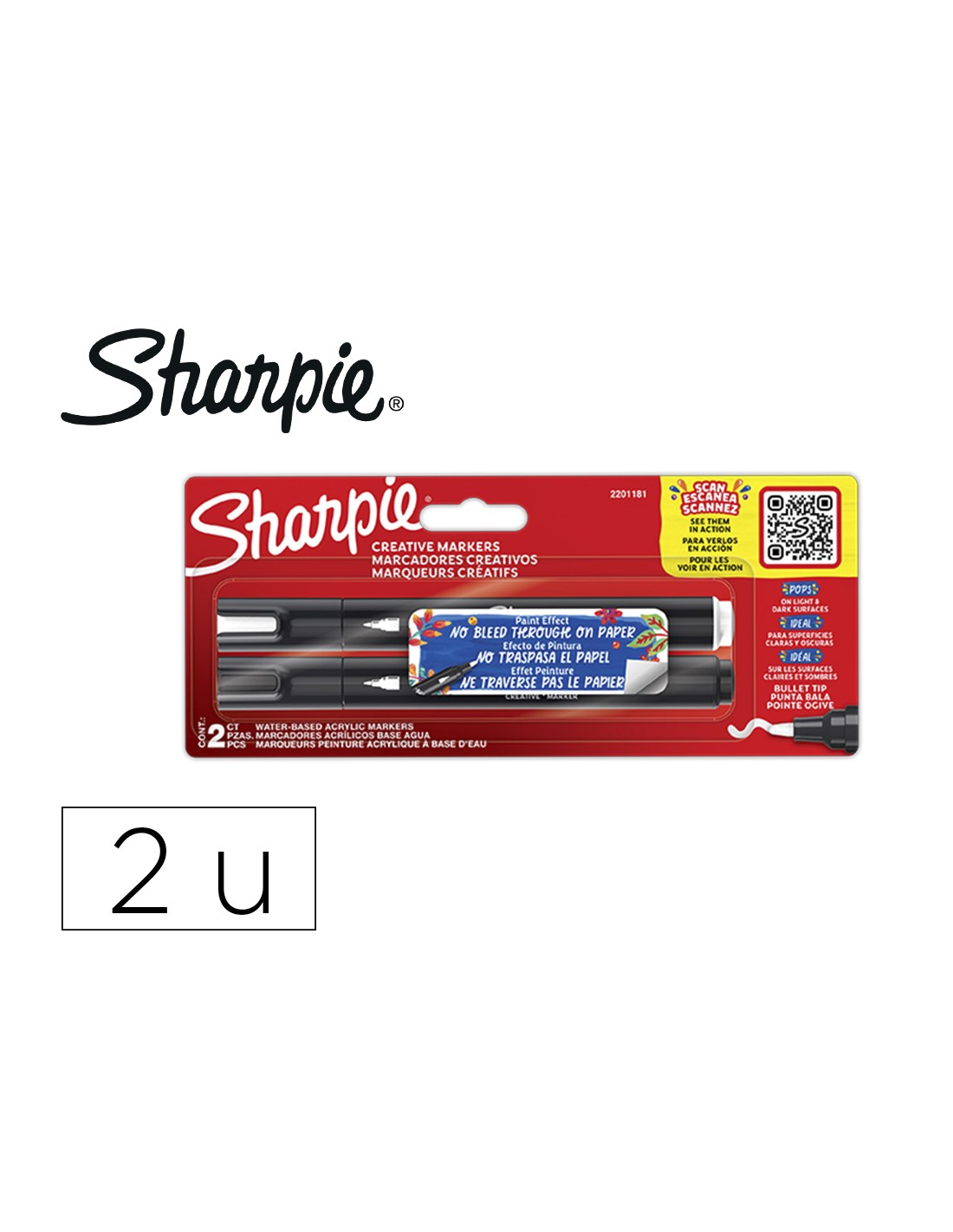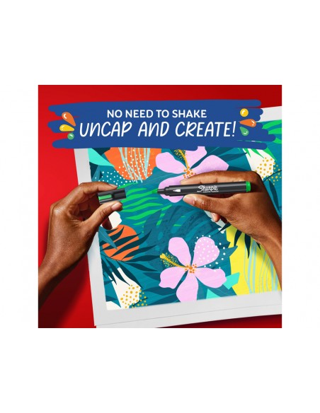 Sharpie rotulador acrílico efecto pintura. Tinta a base de agua que no traspasa el papel. Soluciona la principal frustración del consumidor de este tipo de productos. Destapa y crea Todos los beneficios de un efecto atrevido similar a una pintura sin las molestias y retrasos en el secado. Marcaen metal, madera, cerámica, cristal, piedras, lienzos y mucho más (superf icies oscuras o claras). Color de tinta opaco, ideal para papel oscuro o blanco. Blíster de 2 unidades color negro y blanco. Punta redonda.