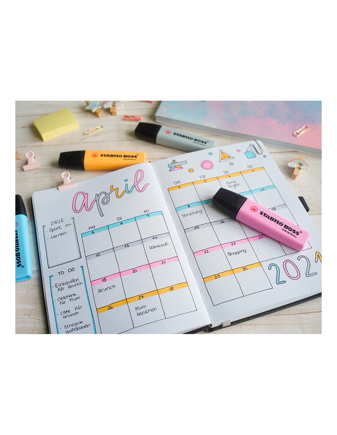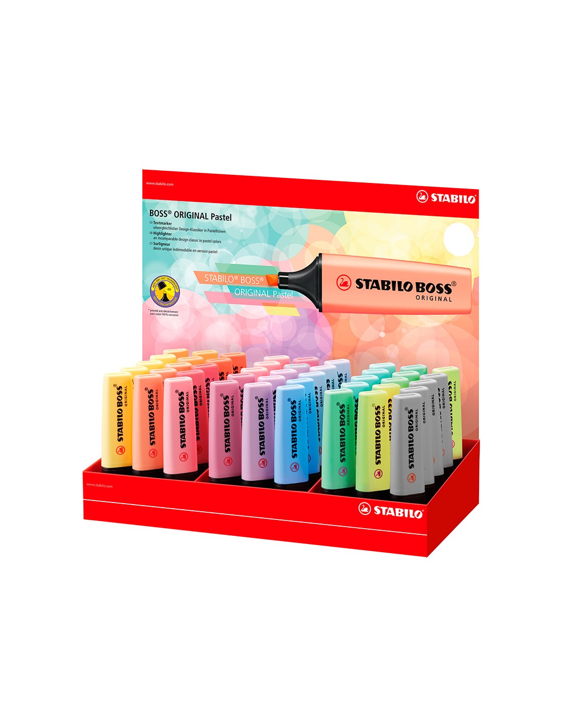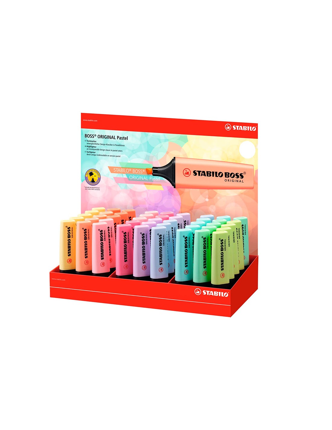 Expositor con 45 marcadores Stabilo Boss Original Pastel. Tecnología Antisecado Stabilo 4 horas de protección antisecado para concentrarse en el trabajo. 2 anchos de trazo 2 + 5 mm. Recargable. Tinta con base acuosa para papel, copias o fax. Económica y fácil recarga. Incuestionable líder de mercado.
