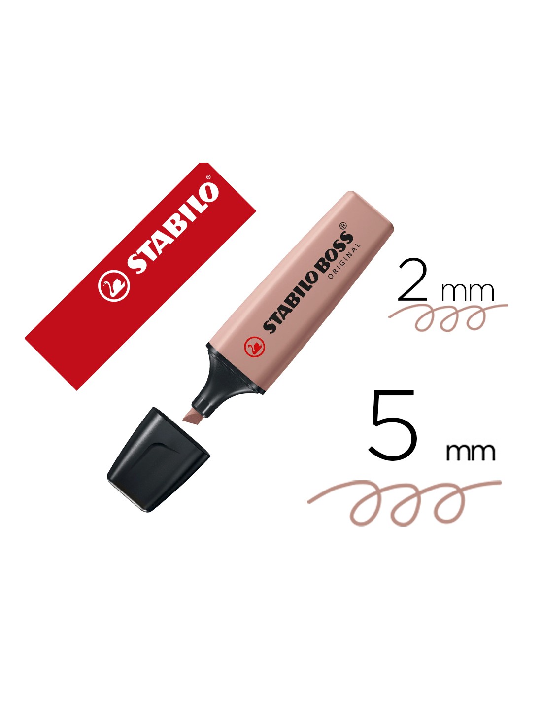Rotulador fluorescente Stabilo Boss Original Pastel Nature Colors. Antisecado, hasta 4 horas destapado sin secarse para poder concentrarse en el trabajo. Resistente a la luz en todo tipo de papel normal, térmico y fotocopias. Punta biselada. Trazo de 2 a 5 mm. Color ocre oscuro.