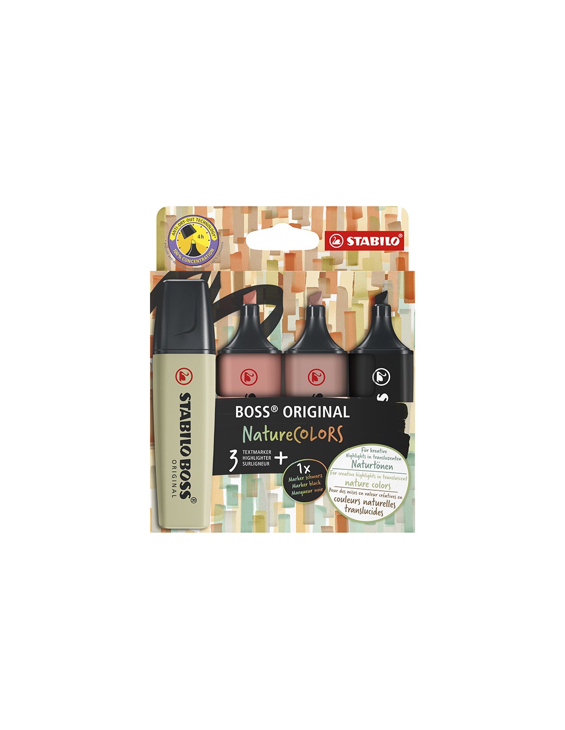 Rotulador fluorescente Stabilo Boss Original Pastel Nature Colors. Antisecado, hasta 4 horas destapado sin secarse para poder concentrarse en el trabajo. Resistente a la luz en todo tipo de papel normal, térmico y fotocopias. Punta biselada. Trazo de 2 a 5 mm. Estuche de 4 unidades colores surtidos.