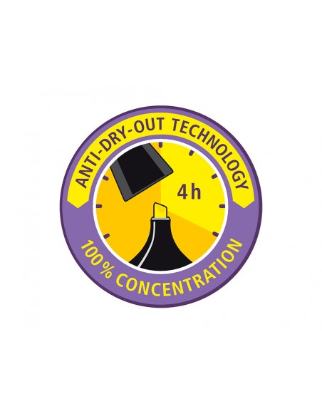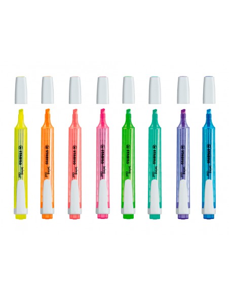 Marcador fluorescente tamaño bolsillo con clip. Gran fluorescencia desde el principio hasta el fin. Tinta a base de agua, resistente a la luz en todo tipo de papel normal, fax, fotocopia, etc. Capuchón ventilado. Punta biselada. Trazo de 2 a 5 mm.