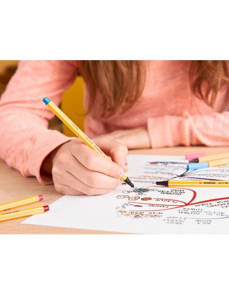 Rotulador con punta fina número uno en Europa. Con un diseño hexagonal de finas líneas inconfundibles. Punta de fibra con refuerzo de metal para una larga vida. Apta para usar con reglas y plantillas. Tinta con base al agua. Larga vida sin tapón. Trazo de 0,4 mm.