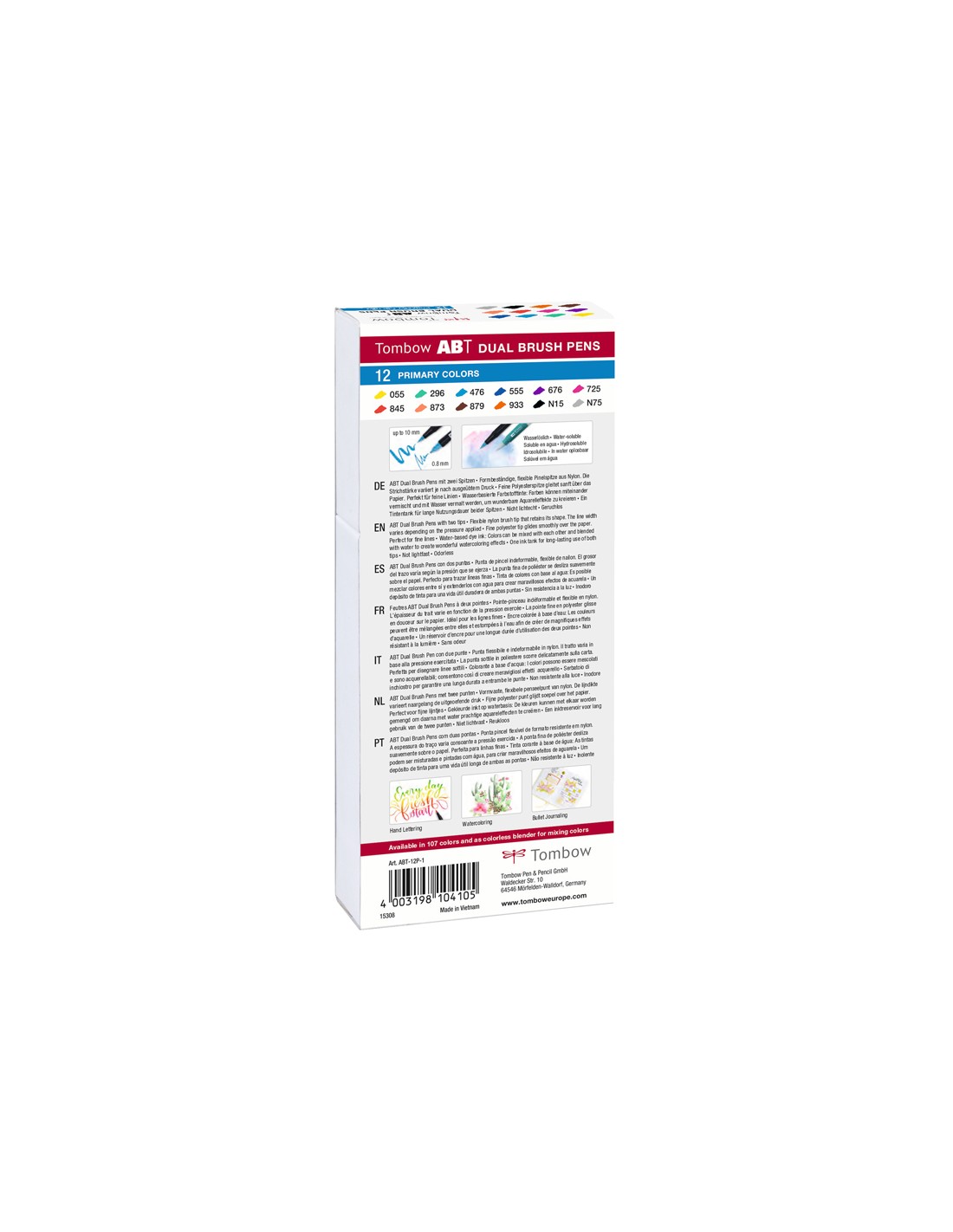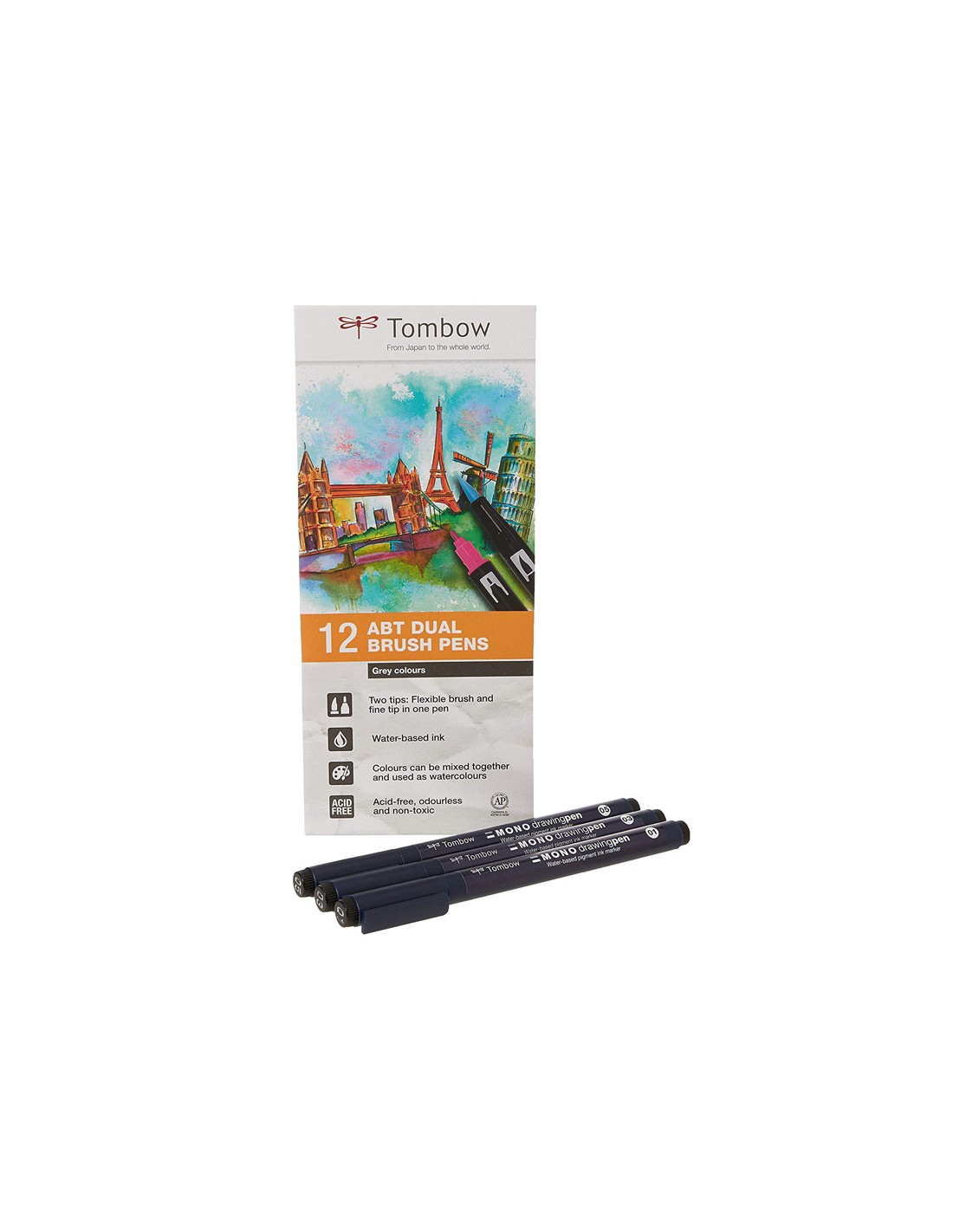 Rotulador doble punta pincel que permite crear diferentes anchos de trazo según la presión ejercida y punta fina superresistente para trazos de precisión y exactitud. Tinta con base de agua libre de ácidos e inodoro. Acuarelable los colores pueden mezclarse entre sí creando llamativas transiciones de color. Perfecto para Hand Lettering, Stamping, Manga, Urban sketching, bocetos, acuarela... La caja de 12 rotuladores.