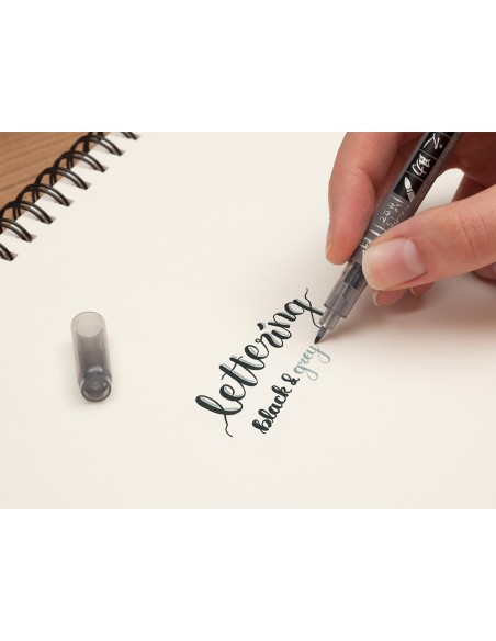 Rotulador con punta elástica y resistente que posibilita la variación de trazos, desde muy fino hasta ancho. El ancho de linea varia dependiendo de la presión ejercida sobre la punta. 2 puntas blandas, adecuado para caracteres ligeramente más grandes. Apto para caligrafía, dibujo, notas visuales, Zentangle, Hand Lettering, notas de boceto, doodling y mucho más. Tinta a base de agua con pigmentos de colores, sin olor. Color negro y gris.