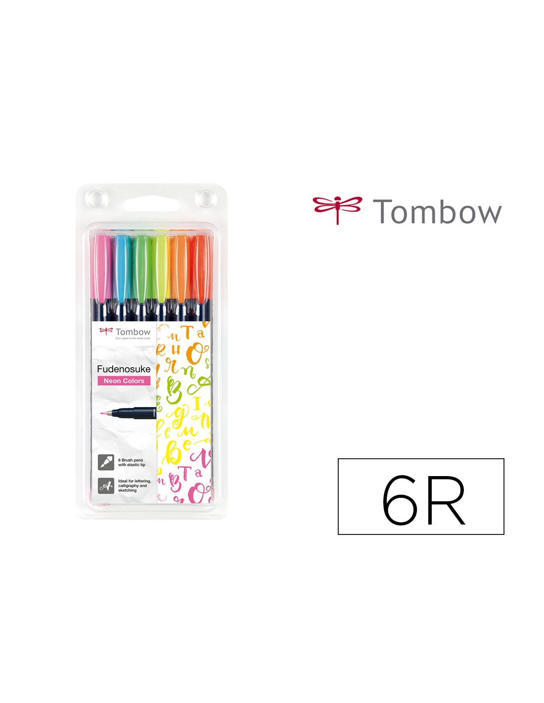 Rotulador tombow fudenosuke tinta base de agua punta pincel dura estuche de 6 unidades colores neon