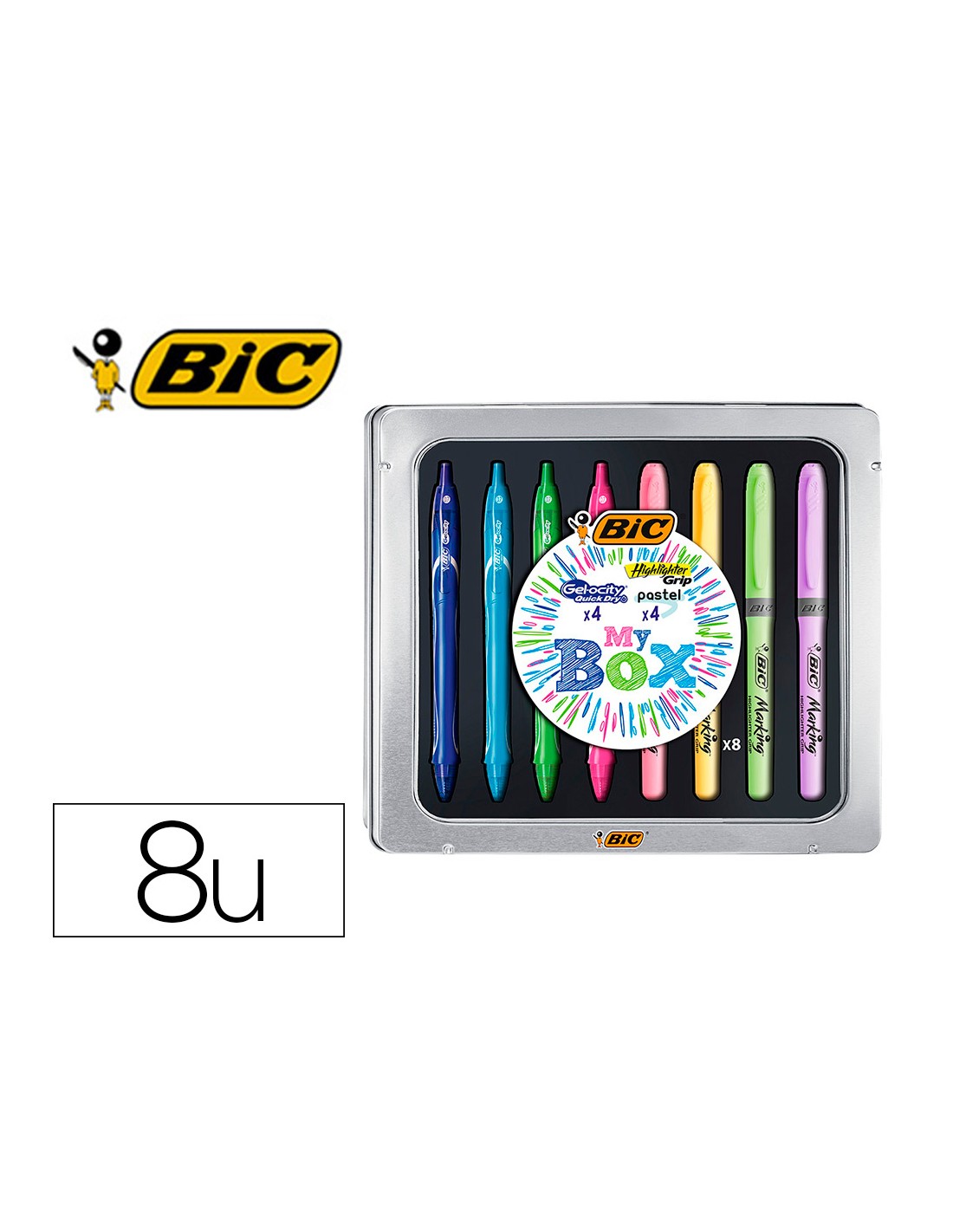 Set bic caja metalica 4 gelocity quick dry colores surtidos + 4 fluorescentes grip colores pastel surtidos