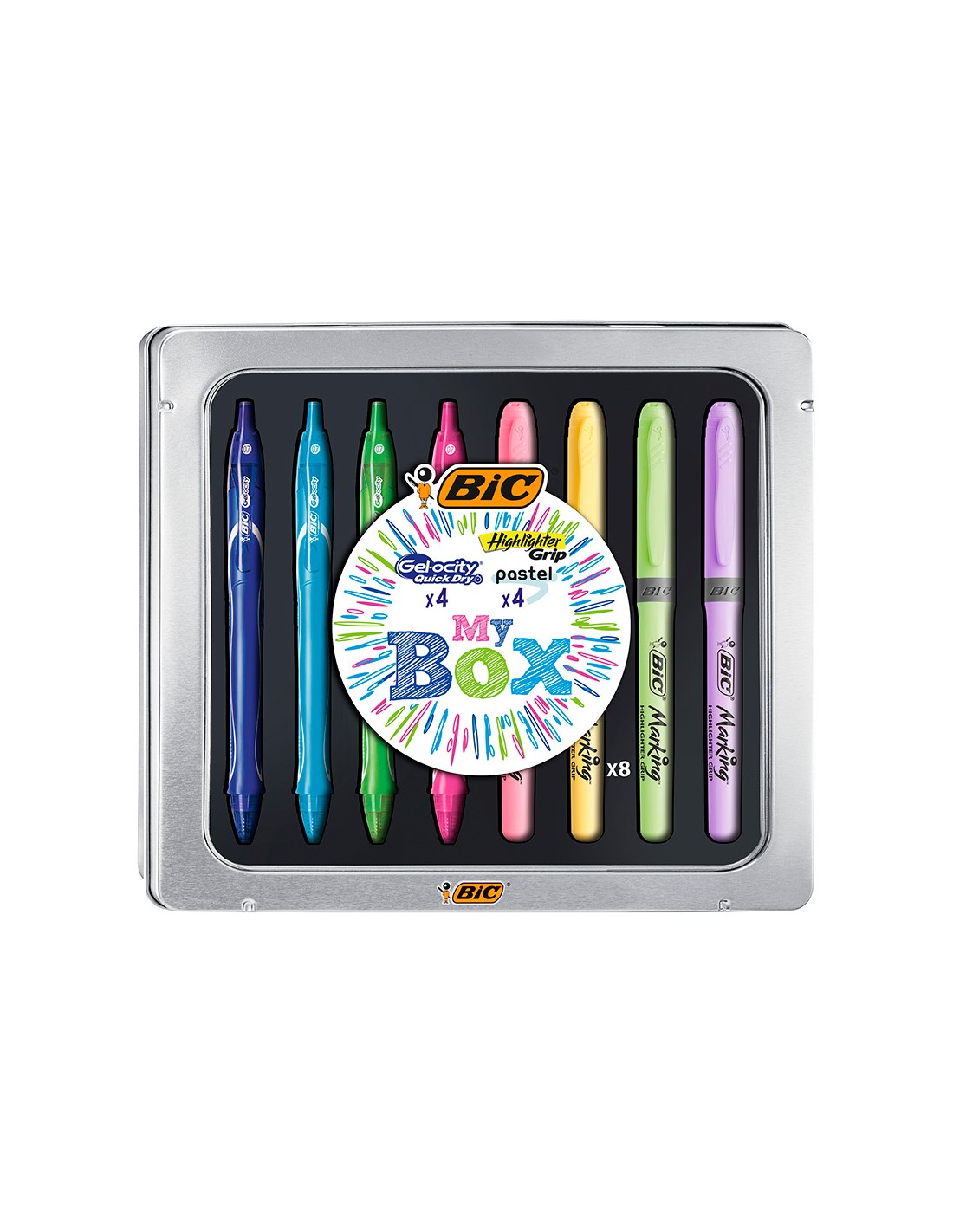 Reafirma tu estilo con esta caja metálica que incluye 4 bolígrafos Gelocity en colores a la moda y 4 marcadores Highlighter Grip Pastel. Los bolígrafos Gelocity de este estuche contienen una tinta de secado ultrarrápido que no gotea ni cala y es perfecta para zurdos. Los marcadores BIC Highlighter Grip Pastel de este pack cuentan con un grip de goma estriado que ofrece una mayor comodidad de uso. El estuche incluye 8 tonos luminosos turquesa, verde lima, rosa, azul, amarillo, rosa pastel, verde pastel y morado pastel. Su caja metálica es reutilizable, puedes utilizarla como estuche para mantener todos tus bolígrafos en orden.