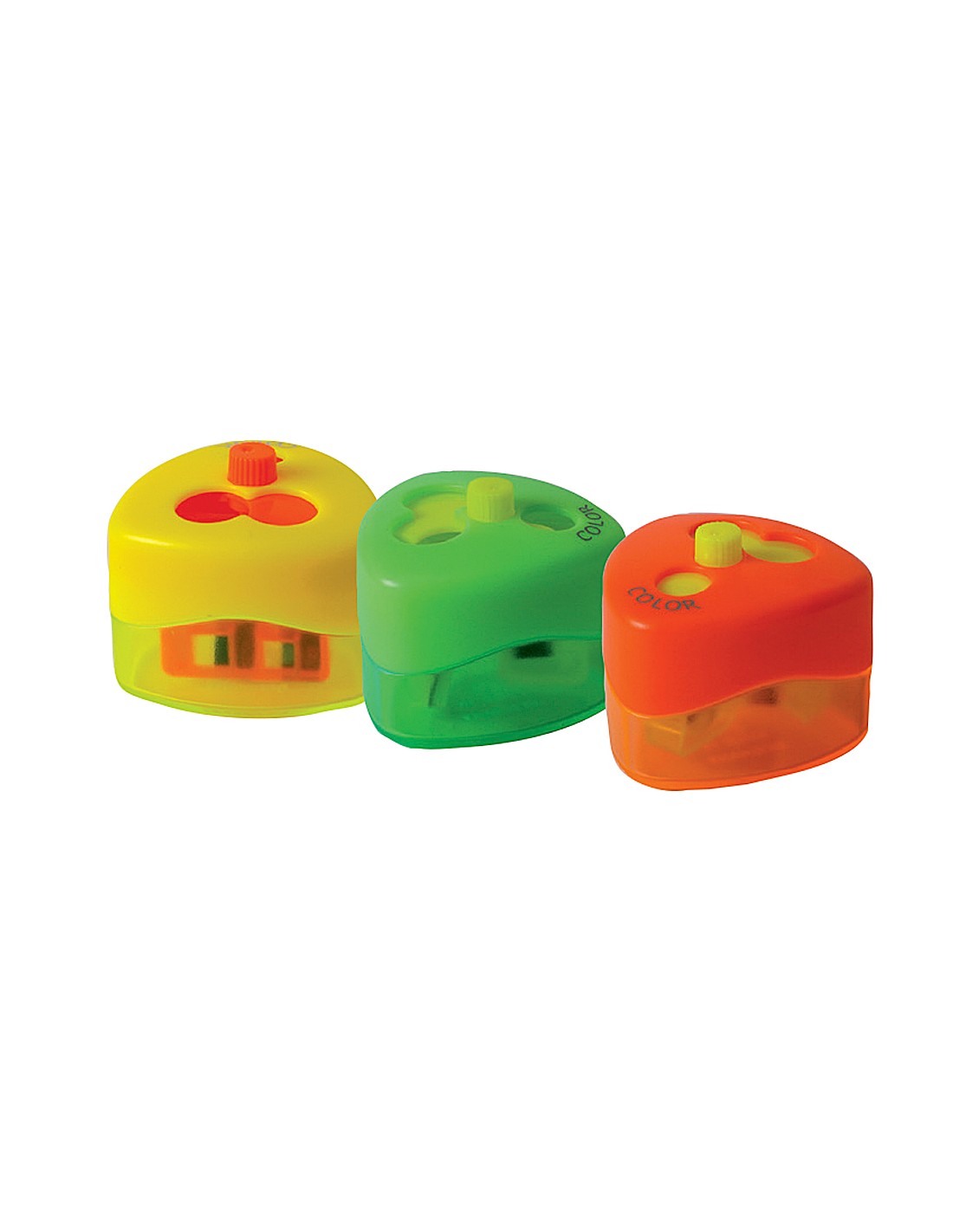 Sacapuntas de interior y cobertura de plástico. Para lápices y ceras. Con tapa, que lo hace más seguro para los niños. Este modelo fue reconocido internacionalmente por su diseño innovador y fue premiado en 2006 por la Asociación de la Prensa del sector de la papelería con el ISPA & Innovation Award. Colores surtidos. Tres usos.