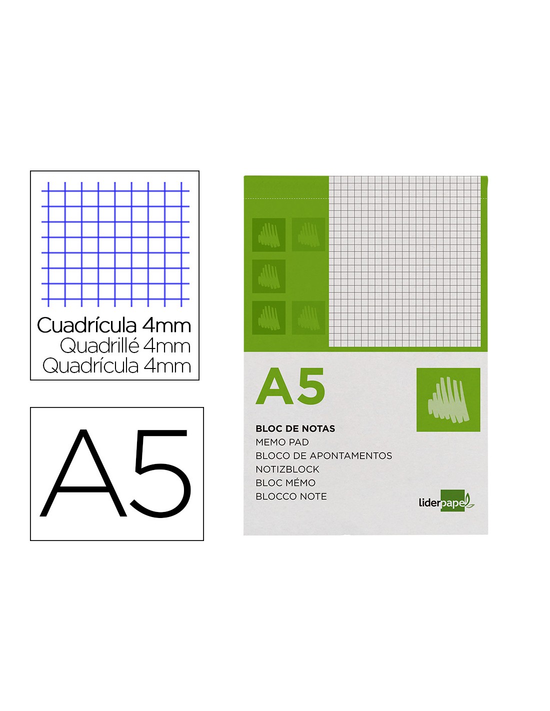 Bloc notas liderpapel cuadro 4mm a5 80 hojas 60g/m2 perforado