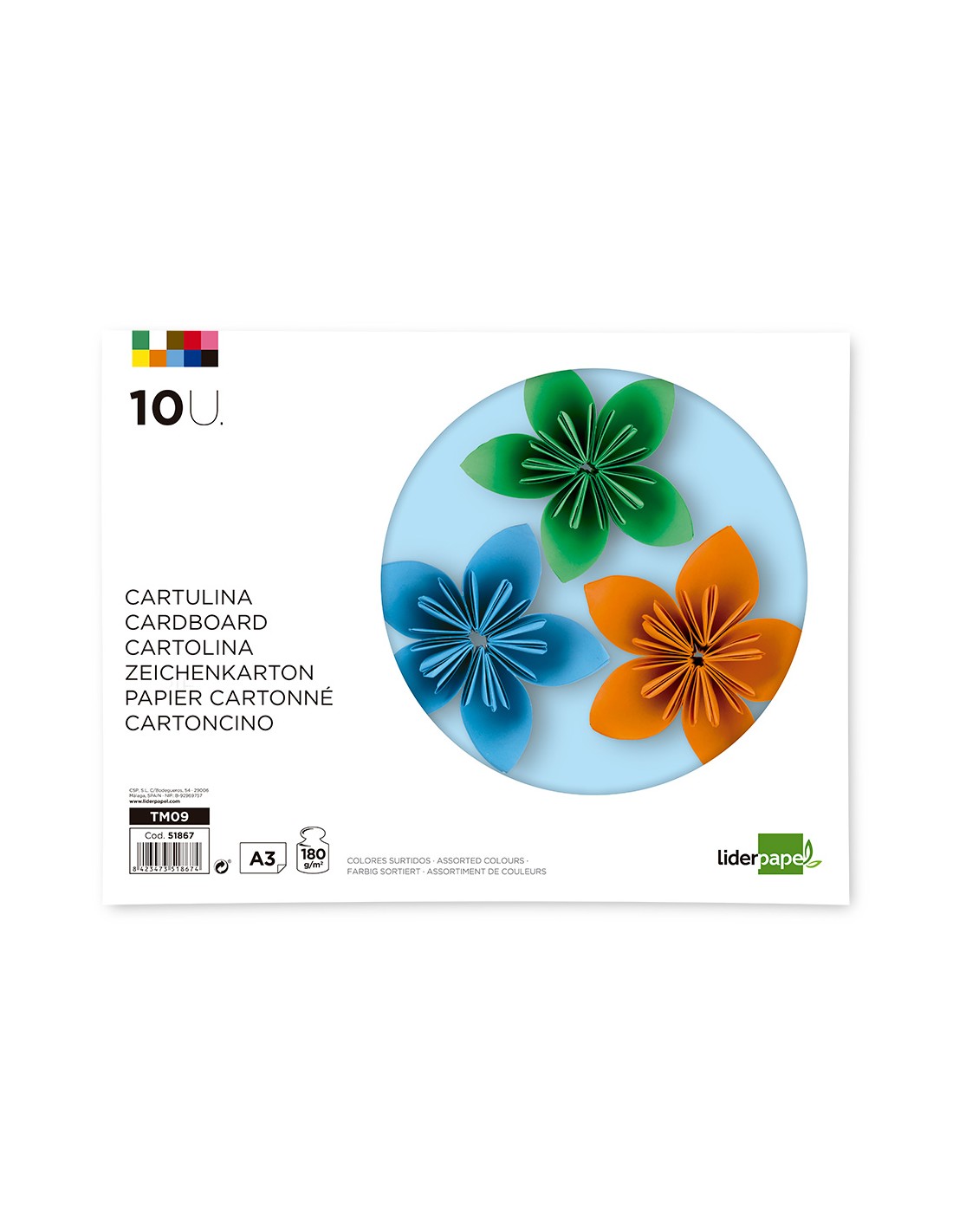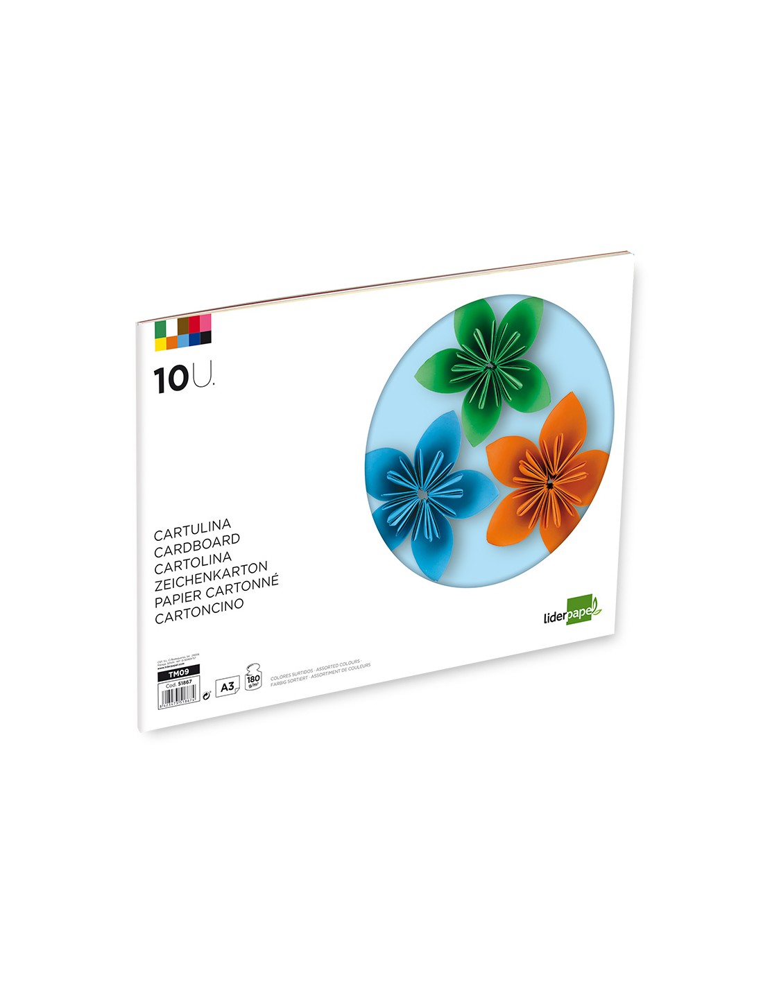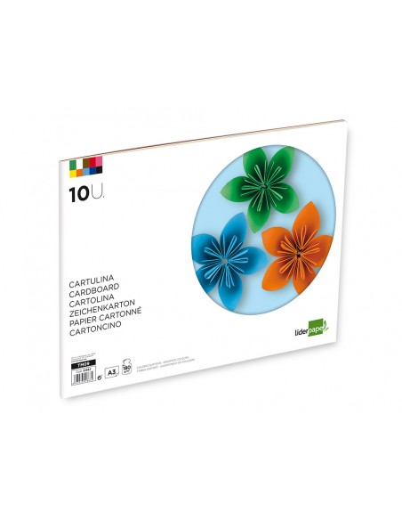 10 hojas de cartulina en colores surtidos. Gramaje 180 g/m².