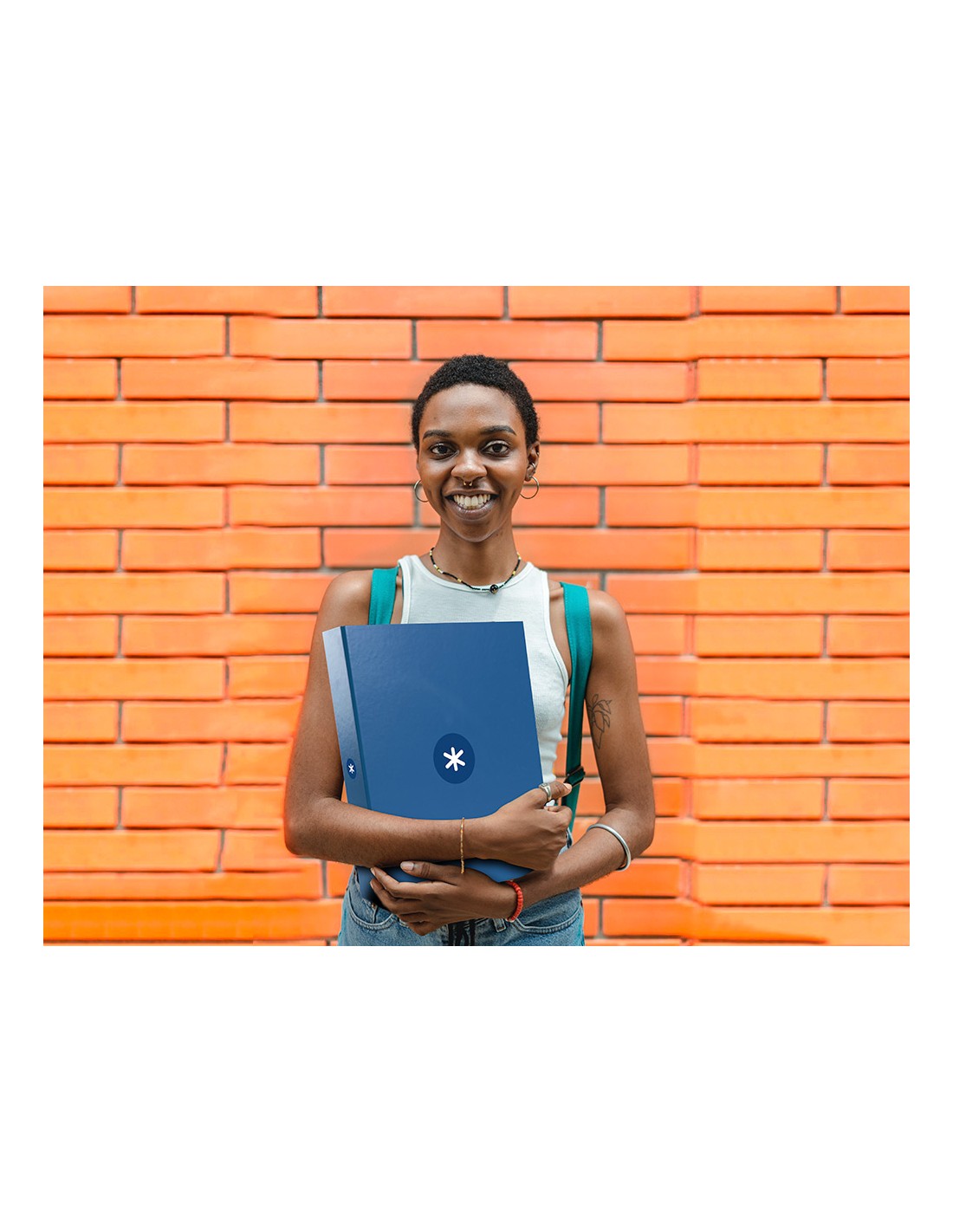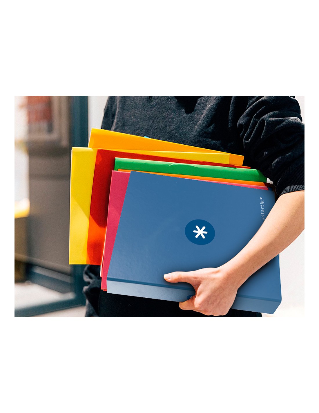 Carpeta fabricada en cartón forrado de 1,5 mm de espesor. Forrada en papel estucado de 135 g/m² impreso. Plastificada mate con detalles en barniz UVI. Con 4 anillas de 40 mm. Guarda interior impresa. Formato DIN A4.
