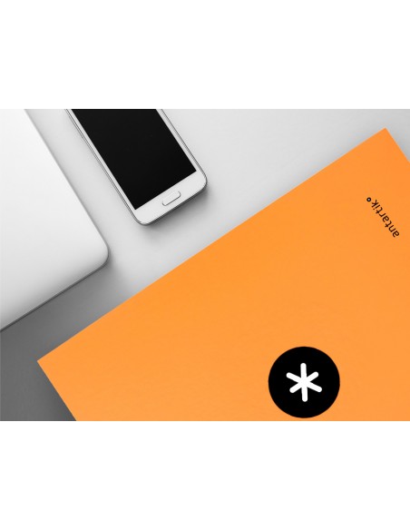 Carpeta fabricada en cartón forrado de 1,5 mm de espesor. Forrada en papel estucado de 135 g/m² impreso. Plastificada mate con detalles en barniz UVI. Con 4 anillas redondas de 25 mm. Guarda interior impresa. Formato DIN A4.