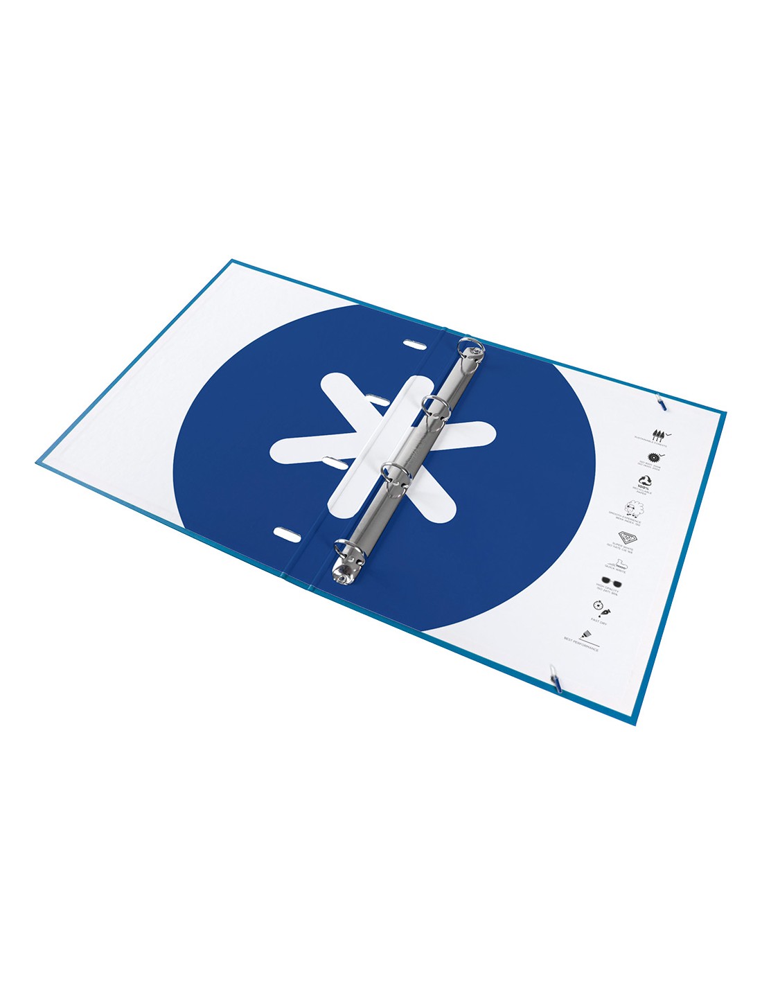 Tapa de cartón forrado de 1,75 mm de espesor. Forrada en papel estucado mate de 135 g/m² impreso. Plastificada mate con detalles barniz UVI. 4 anillas redondas. Cierre de gomilla. Con ranuras para anillas. 100 hojas con 5 bandas de color y 4 taladros. Papel interior extrablanco de 100 g/m². Ultrasuave. Cuadrícula de 5 mm. Formato DIN A4. Guarda interior impresa.
