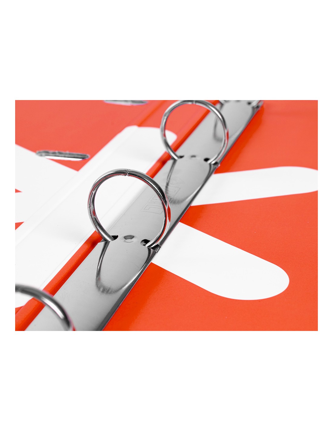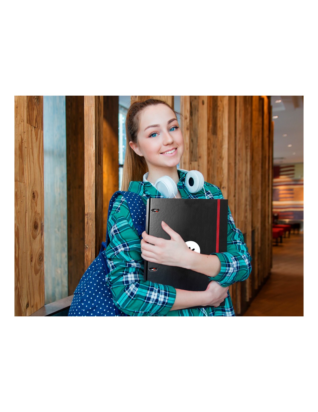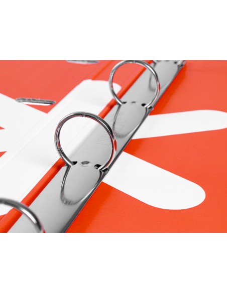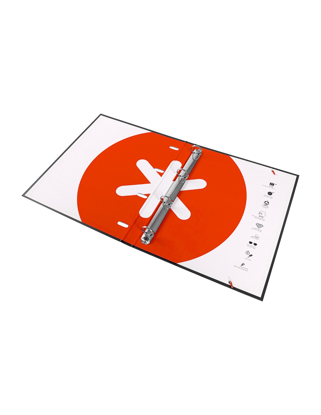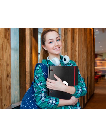 Tapa de cartón forrado de 1,75 mm de espesor. Forrada en papel estucado mate de 135 g/m² impreso. Plastificada mate con detalles barniz UVI. 4 anillas redondas. Cierre de gomilla. Con ranuras para anillas. 100 hojas con 5 bandas de color y 4 taladros. Papel interior extrablanco de 100 g/m². Ultrasuave. Cuadrícula de 5 mm. Formato DIN A4. Guarda interior impresa.