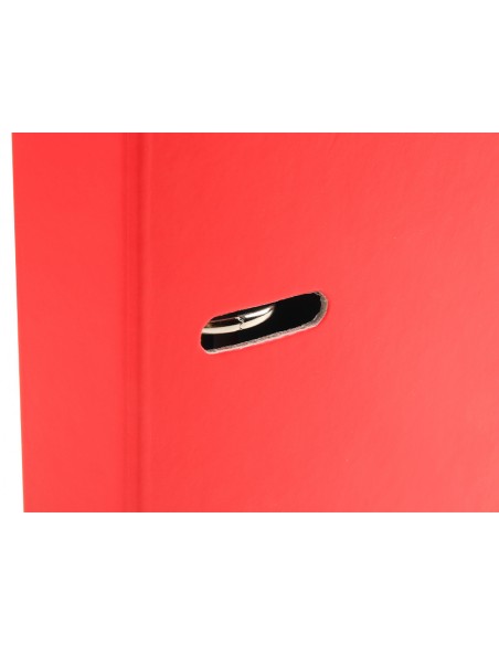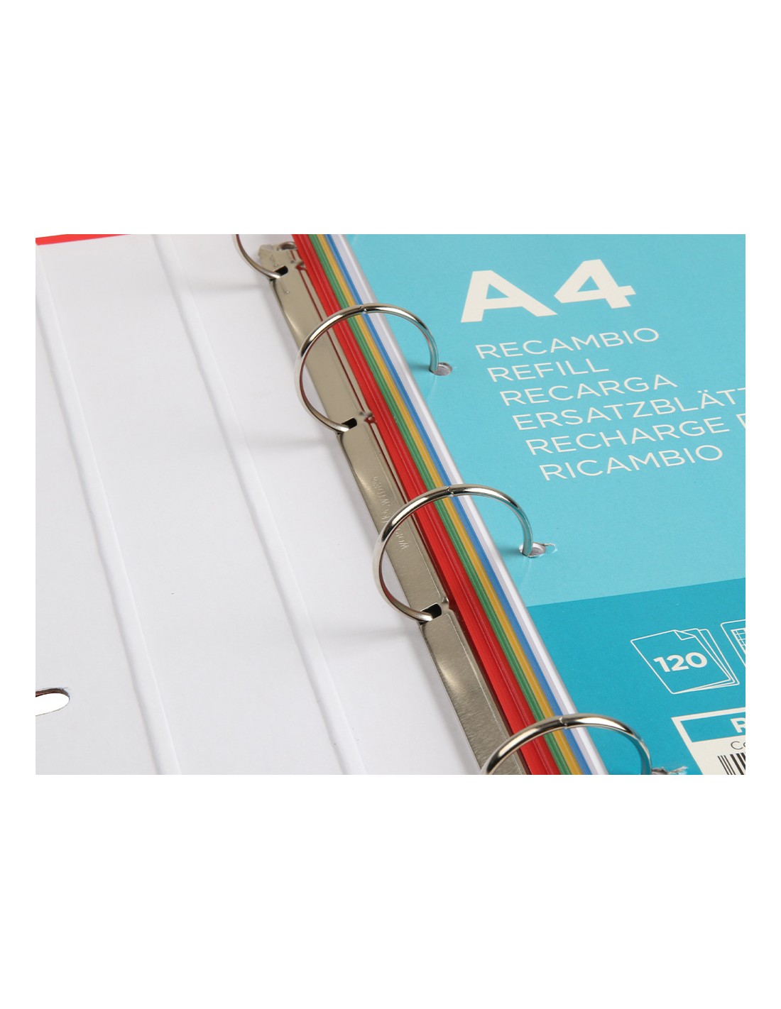 Tapa de cartón forrada de 1,75 mm de espesor. 4 anillas redondas de 40 mm. Cierre de gomilla. Con ranuras para anillas. Lomo de 20 mm. 120 hojas con 5 bandas de colores. Papel interior de 80 g/m². Cuadrícula de 5 mm. Formato DIN A4. Guarda interior impresa. Colores surtidos.