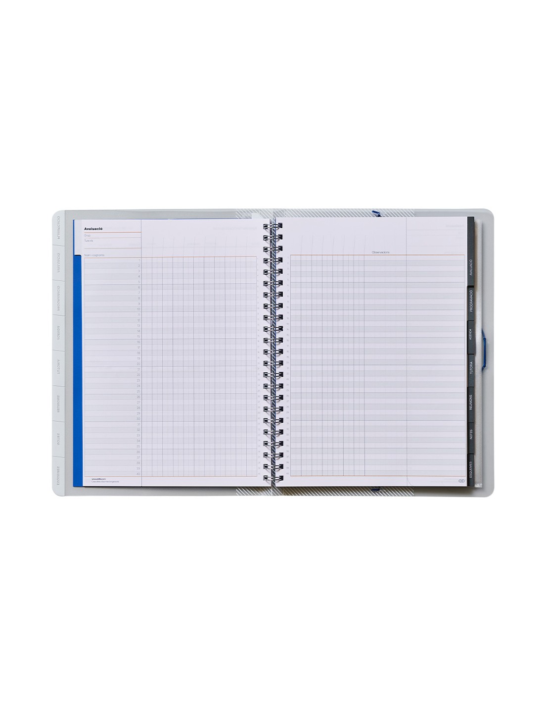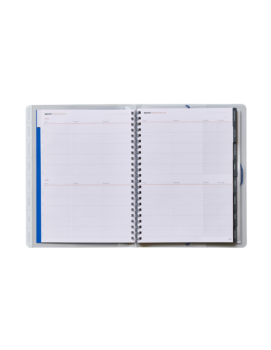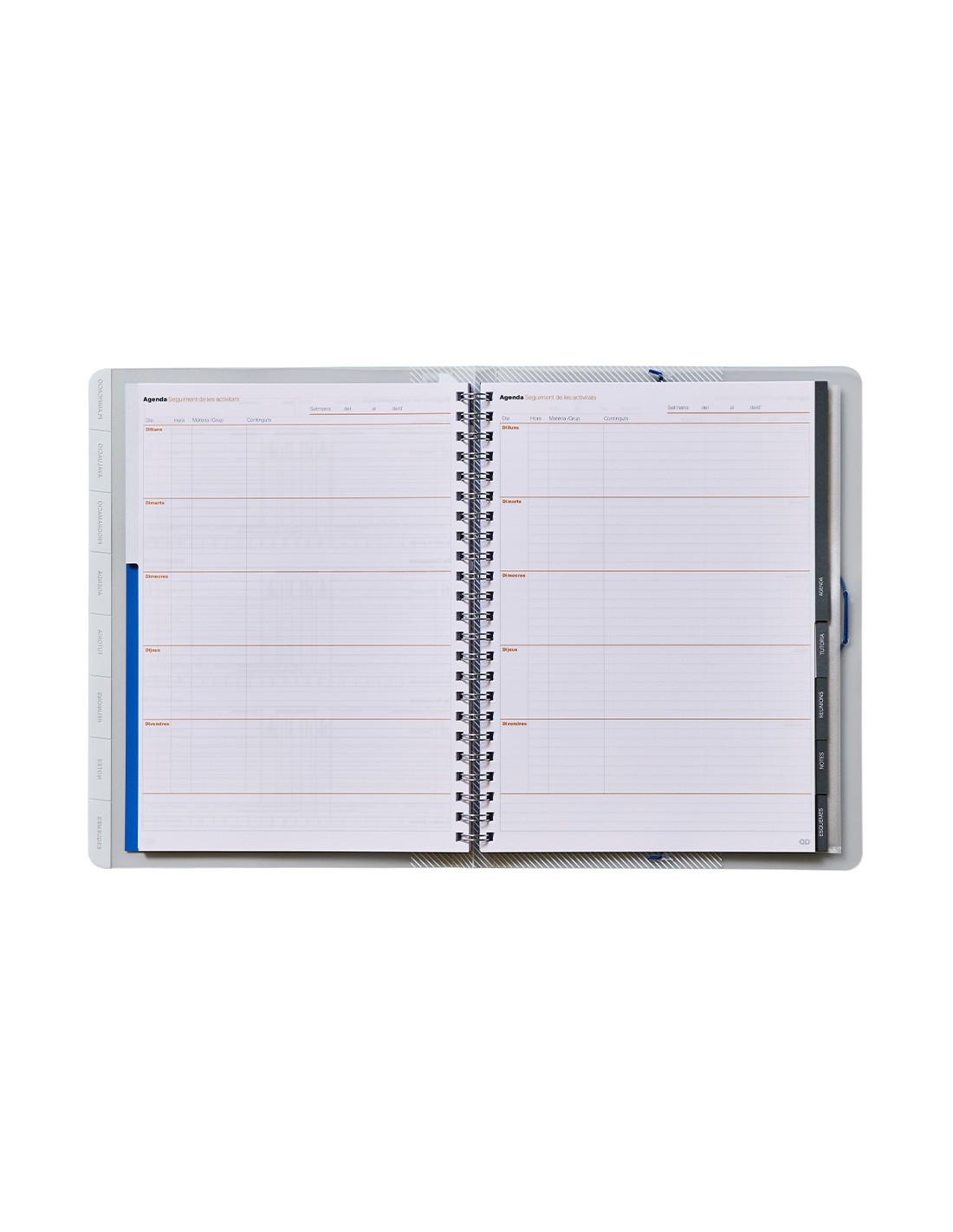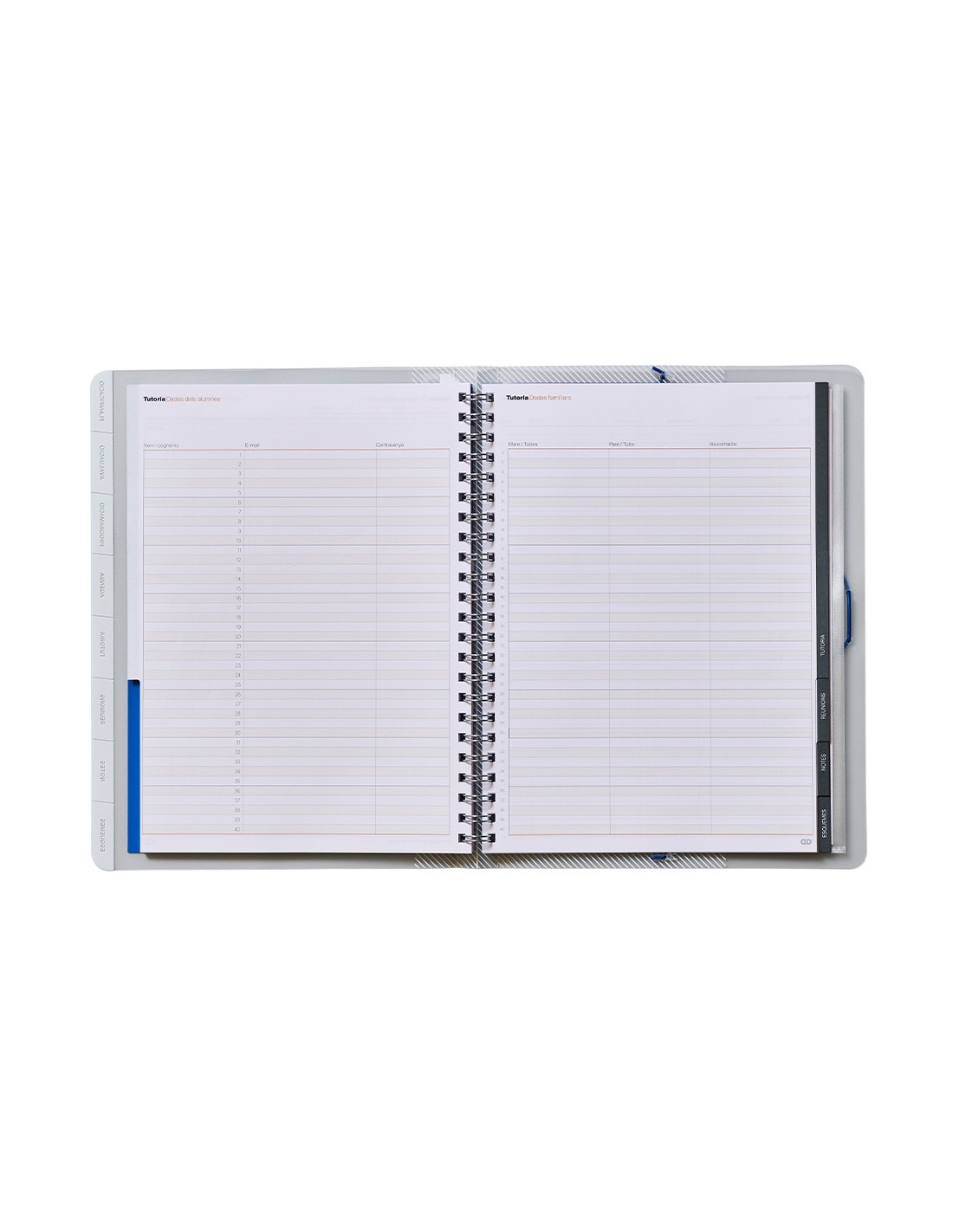 Carpeta con organización por pestañas. Contenido datos personales y horario, planificación mensual, evaluación continua, registro de la programación, agenda (40 semanas), tutoría, reuniones. Con doble espiral, regla marca páginas, fundas de polipropileno y etiquetas autoadhesivas para la lista de alumnos. Tamaño 24 x 32 cm.