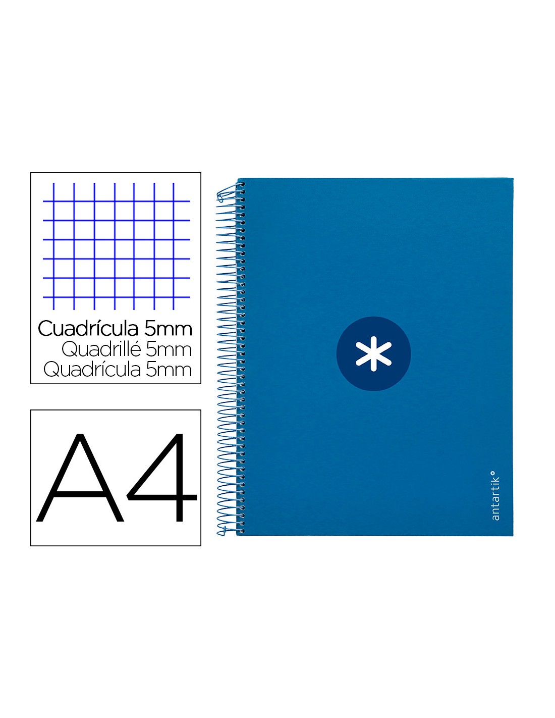Cuaderno espiral a4 micro antartik tapa forrada 120h 90 gr cuadro 5mm 5 bandas 4 taladros color azul marino