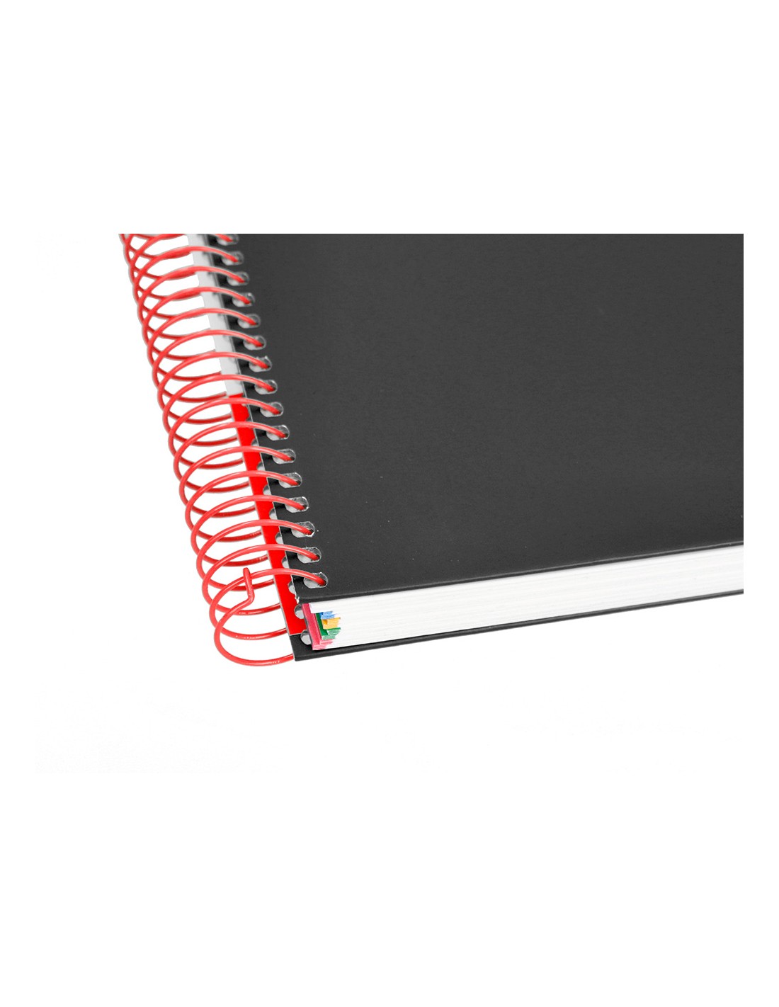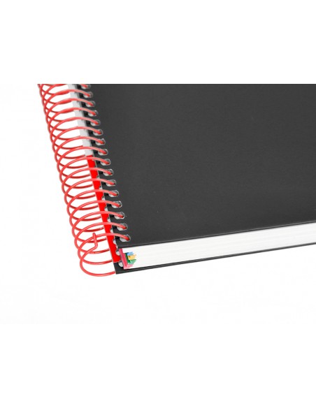El cuaderno de más alta gama del mercado exclusivo diseño, características inigualables, un cuaderno sin precedentes que se distingue por la suavidad y blancura de su papel, y además hace la escritura muy fluida. Tapa de cartón entrecolado de 1,5 mm de espesor, forrado a una cara con papel estucado mate extrasuave y reserva de barniz UVI. Guarda interior impresa. 100 y 120 hojas. Gran resistencia y rigidez. Papel extrablanco de 90 g/m²,  ultrasuave que hace la escritura mucho más fluida. La tinta no traspasa. 4 bandas de colores (formato A6) y 5 bandas de colores (formatos A5 y A4). Espiral nylonizada de colores. Coil-lock.