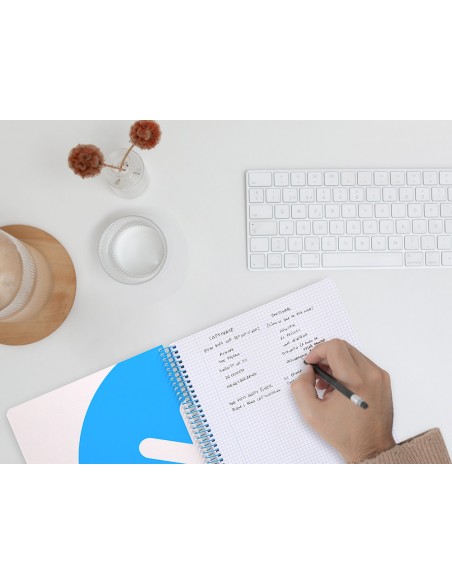 El cuaderno de más alta gama del mercado exclusivo diseño, características inigualables, un cuaderno sin precedentes que se distingue por la suavidad y blancura de su papel, y además hace la escritura muy fluida. Tapa dura de cartoncillo de 800 g/m² con doble encolado, impresa y plastificada mate extrasuave. Interior de portada impresa y plastificada mate. Gran resistencia y rigidez. Papel extrablanco de 100 g/m², ultrasuave que hace la escritura mucho más fluida. La tinta no traspasa. Espiral nylonizada de colores. Coil-lock.