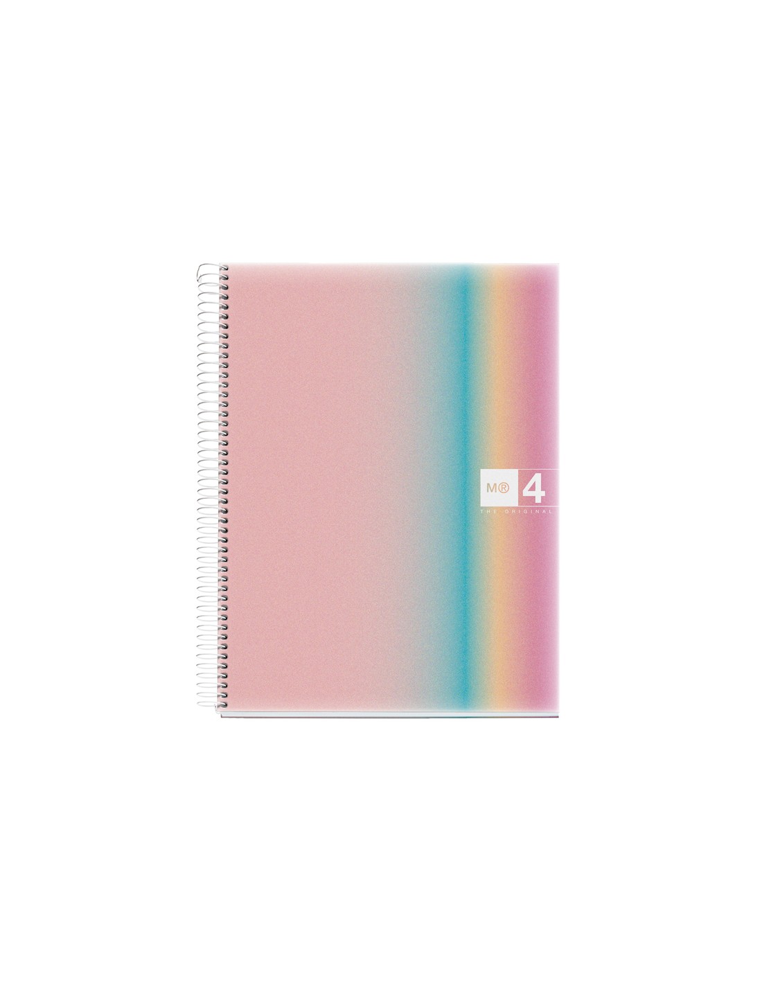 Cuaderno espiral Miquelrius Din A4 (210 x 297 mm). Cubiertas Polipropileno translúcido impreso de 0,8 mm. Espiral Metálica continua que permite laapertura en plano del cuaderno, además de dar la vuelta completa, y con c ierre coilock que evita enganches. Papel interior extra opaco de 70 g/m²,evita que la tinta traspase y seca rápidamente. Hojas 120 hojas con band a de color en el lateral (4 colores, 30 hojas por color), ideales para poder clasificar apuntes y usar un color para cada asignatura, cabecera para títulos, microperforado para un arranque limpio y 4 taladros para archivar. Rayado Cuadrícula 5 mm.