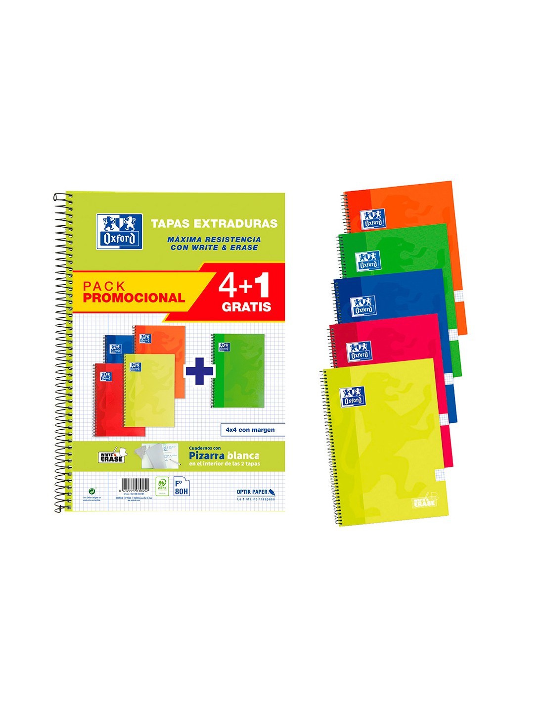 Cuaderno espiral oxford tapa extradura folio 80 hojas cuadro 4 mm con pizarra blancapack 4+1 colores clasicos
