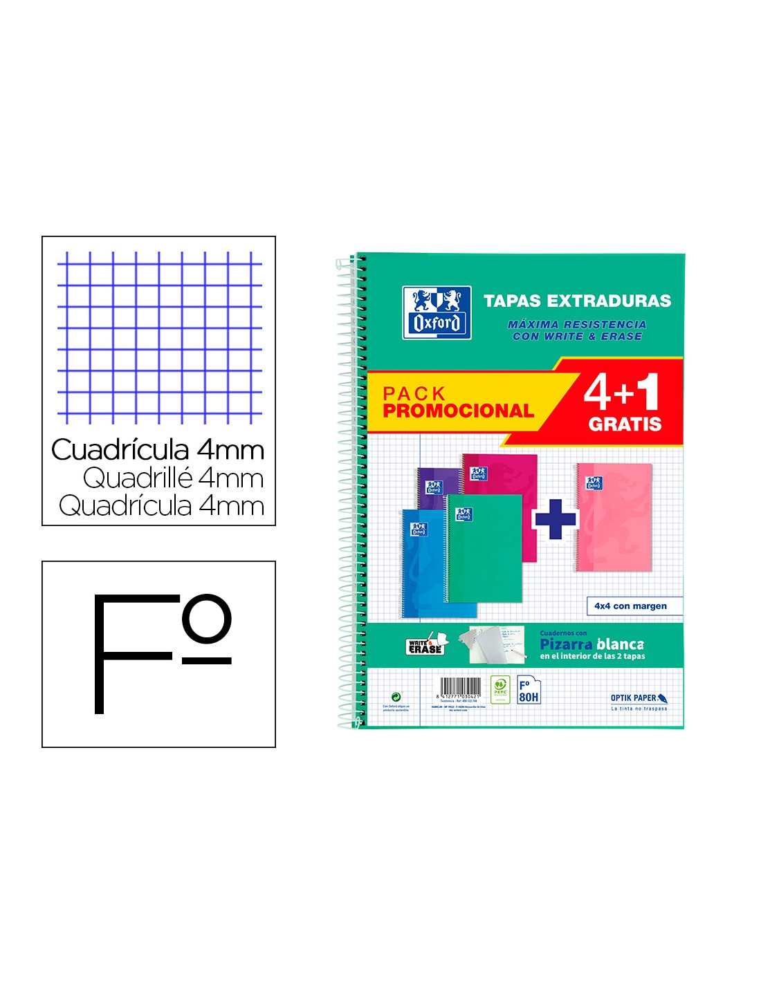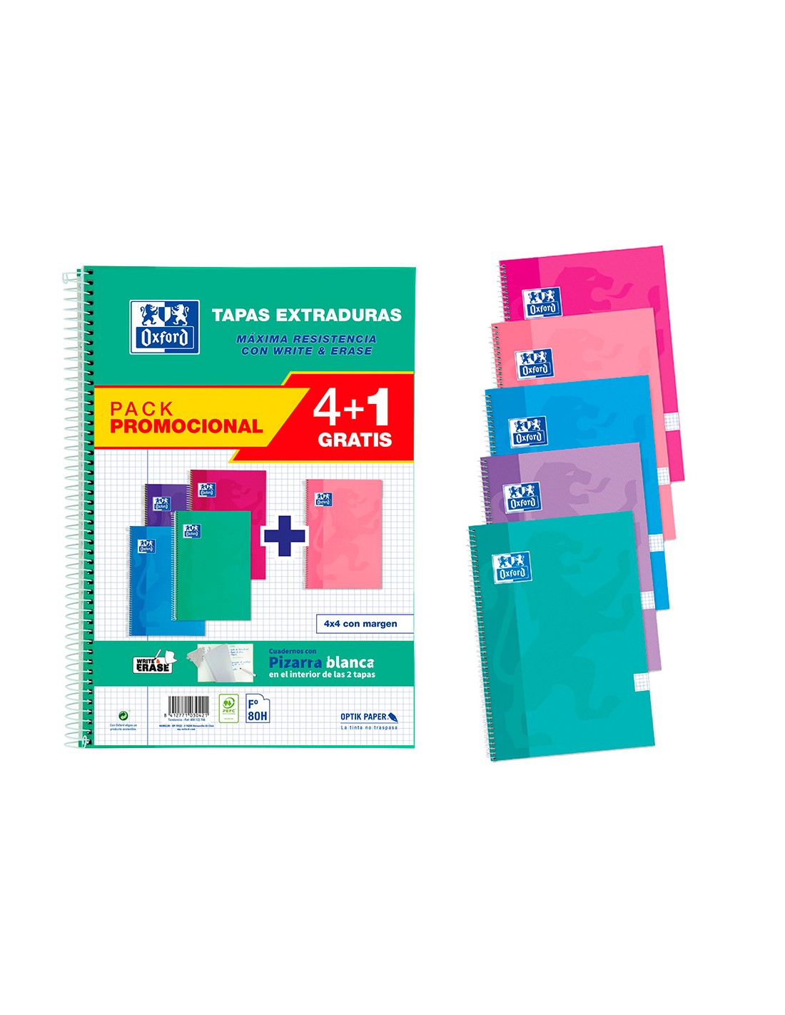 Cuaderno espiral oxford tapa extradura folio 80 hojas cuadro 4 mm con pizarra blancapack 4+1 colores tendencia