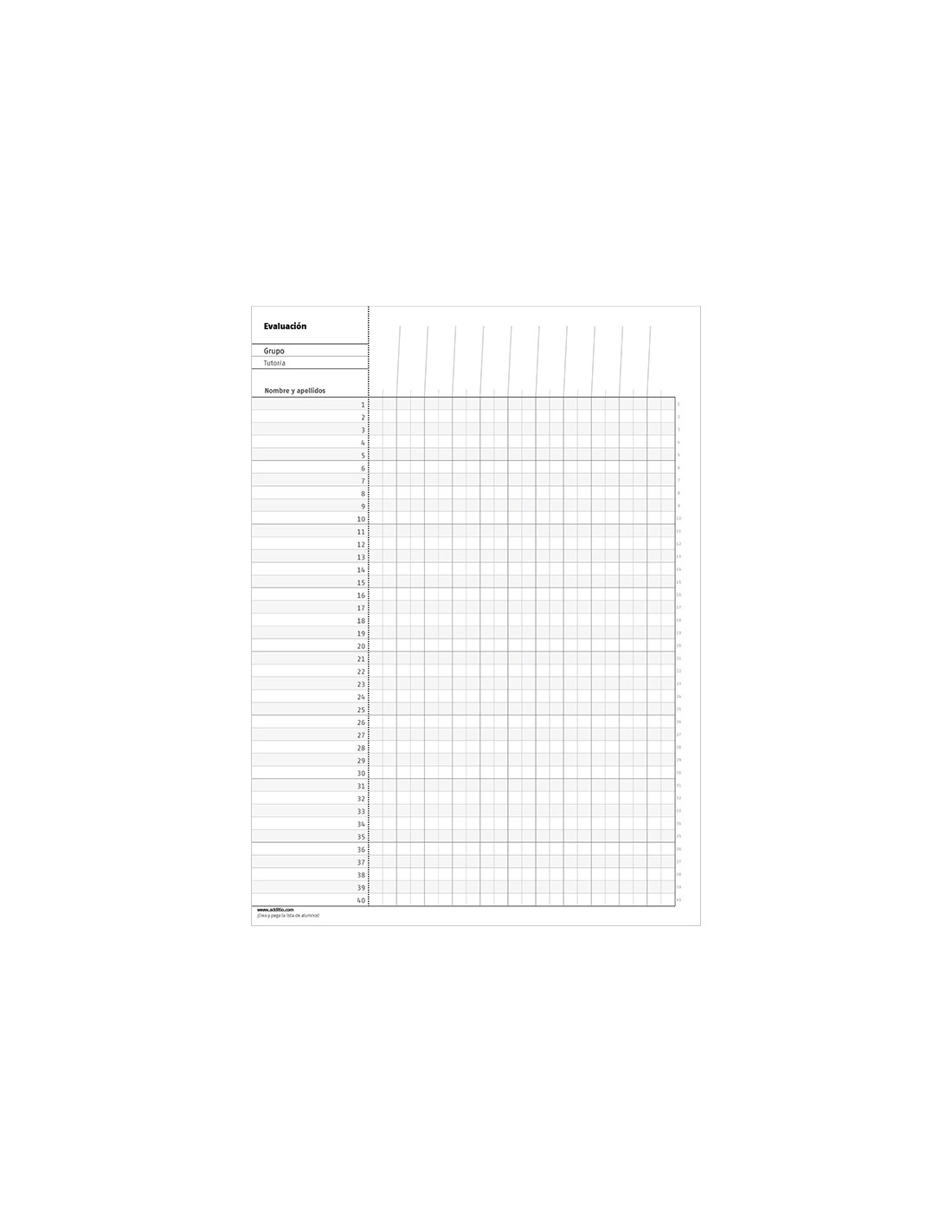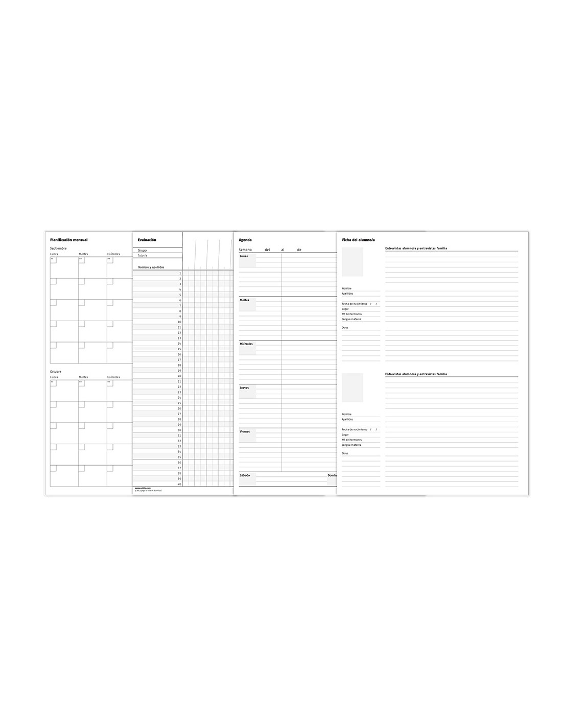 Bloc para la planificación, la organización de las actividades y la evaluación del alumnado. Tríplex, 3 funciones ideal evaluación continua, agenda/plan semanal y tutoría. Contenido datos personales y horario, plan mensual del curso, evaluación continua, agenda-plan semanal, tutoría con datos personales y familiares de los alumnos, entrevistas, reuniones, anotaciones, webs de interés, direcciones y teléfonos. Incluye Wire-o y fundas de polipropileno transparente, calendario y etiquetas autoadhesivas para la lista de alumnos. Con encuadernación de espiral doble. Colores surtidos. Medidas 22,5 x 31 cm.