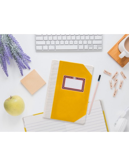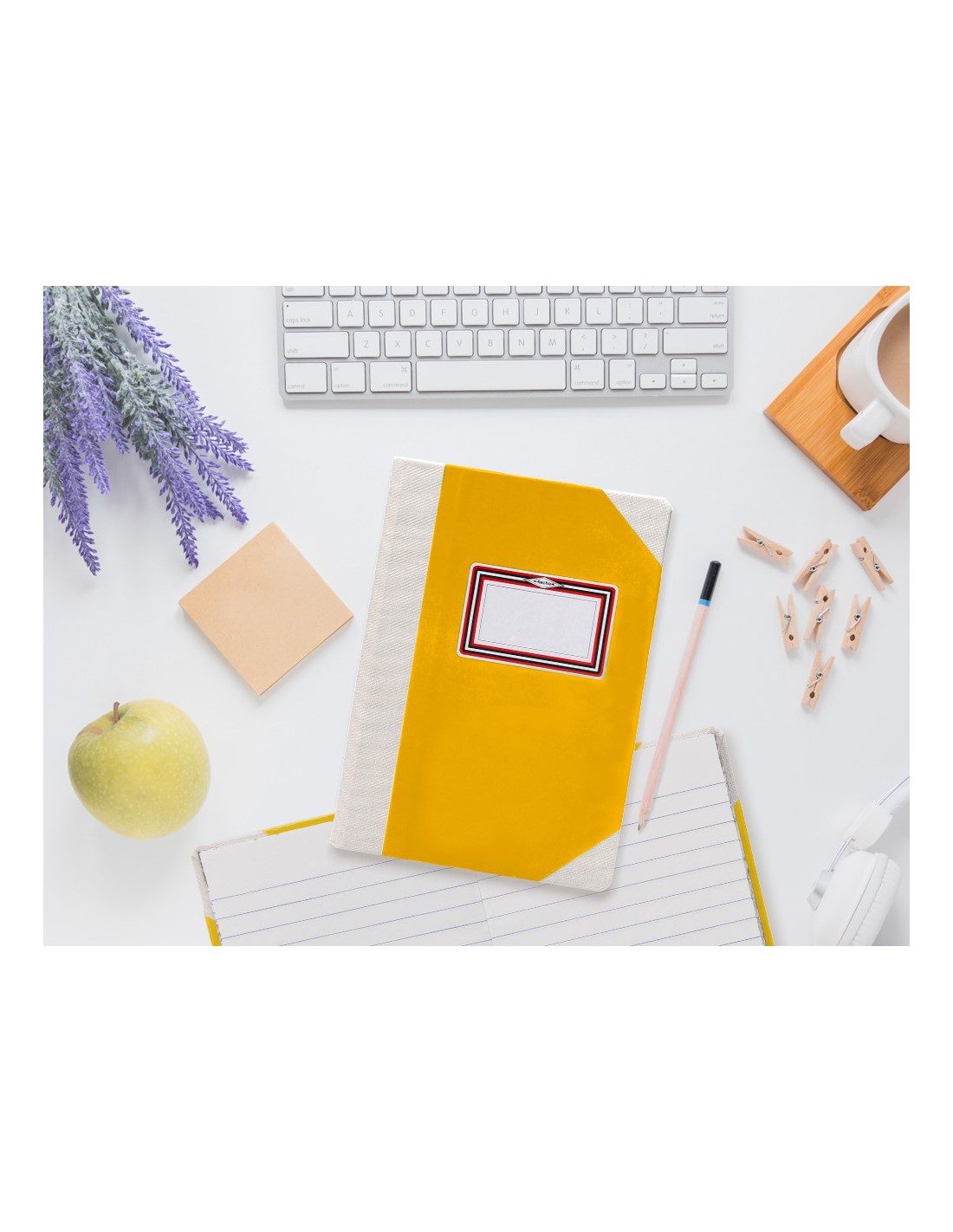 Libro cosido manualmente. Tapa forrada con cartón 2 mm. Interior en papel Offset 100 gr/m². Ideal para registros, memos, notas diversas, dibujo y sketching. Din A4+. Impresión rayado horizontal. Color amarillo.