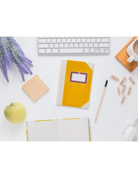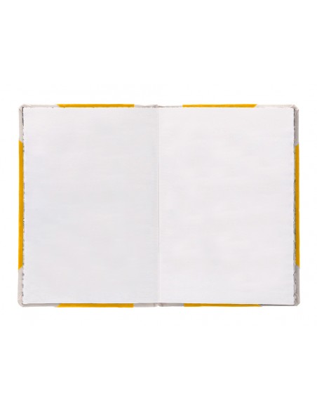 Libro cosido manualmente. Tapa forrada con cartón 2 mm. Interior en papel Offset 100 gr/m². Ideal para registros, memos, notas diversas, dibujo y sketching. Din A5+. Impresión liso. Color amarillo.