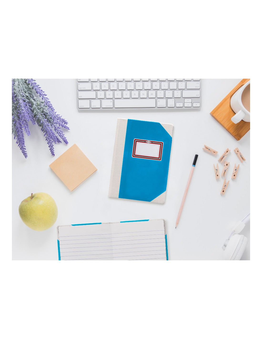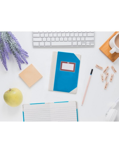 Libro cosido manualmente. Tapa forrada con cartón 2 mm. Interior en papel Offset 100 gr/m². Ideal para registros, memos, notas diversas, dibujo y sketching. Din A5+. Impresión rayado horizontal. Color azul