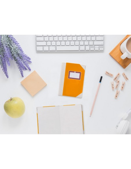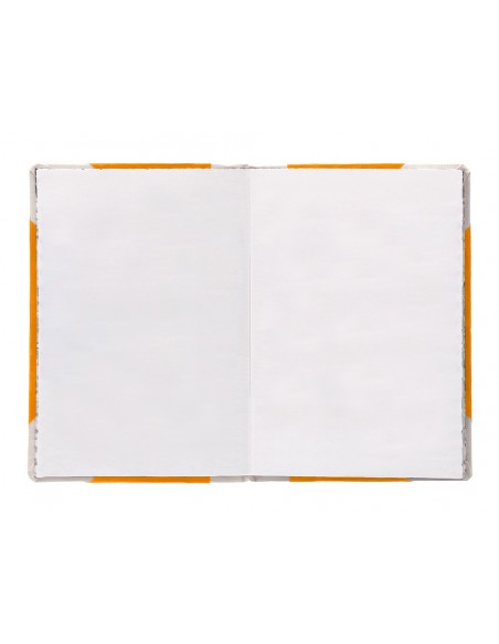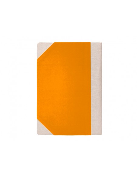 Libro cosido manualmente. Tapa forrada con cartón 2 mm. Interior en papel Offset 100 gr/m². Ideal para registros, memos, notas diversas, dibujo y sketching. Din A6+. Impresión liso. Color naranja.