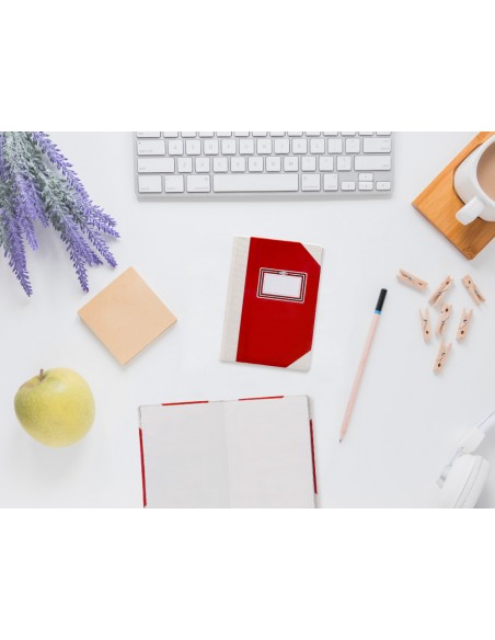Libro cosido manualmente. Tapa forrada con cartón 2 mm. Interior en papel Offset 100 gr/m². Ideal para registros, memos, notas diversas, dibujo y sketching. Din A6+. Impresión liso. Color rojo.
