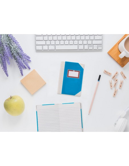 Libro cosido manualmente. Tapa forrada con cartón 2 mm. Interior en papel Offset 100 gr/m². Ideal para registros, memos, notas diversas, dibujo y sketching. Din A6+. Impresión rayado horizontal. Color azul