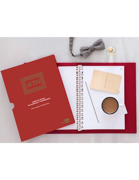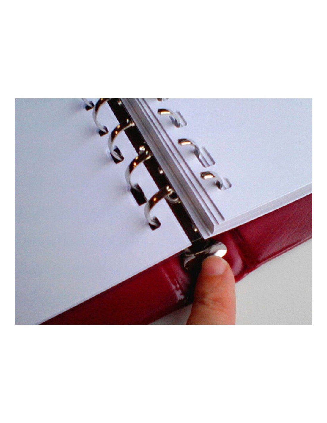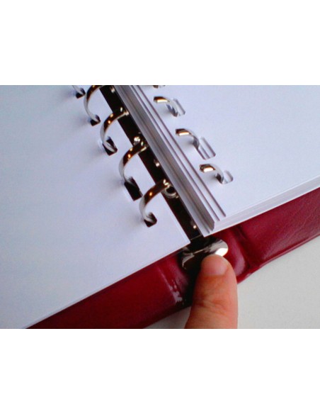 Libro con hojas movibles taladradas y numeradas. Utilizables en impresora. Cubiertas en plástico color burdeos. Mecanismo con caja archivadora, 30 anillas de 25 mm de diámetro. Papel de 100 g/m². 100 hojas lisas foliadas. Formato DIN A4.