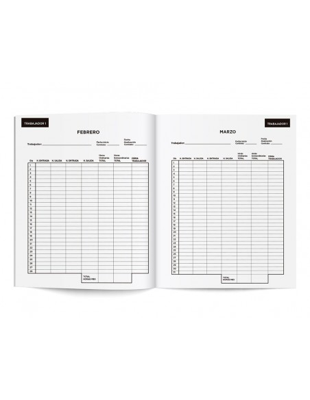 Libro para registro de jornada de empleados. Se pueden registrar hasta 10 trabajadores diferentes para el año completo. 1 mes por página. Ideal para pequeñas empresas y autónomos. Espacio para registro de horas, recuento horas totales ordinarias y extraordinarias y firma del trabajador. 120 hojas. Papel blanco de 90 g/m². Formato DIN A4.