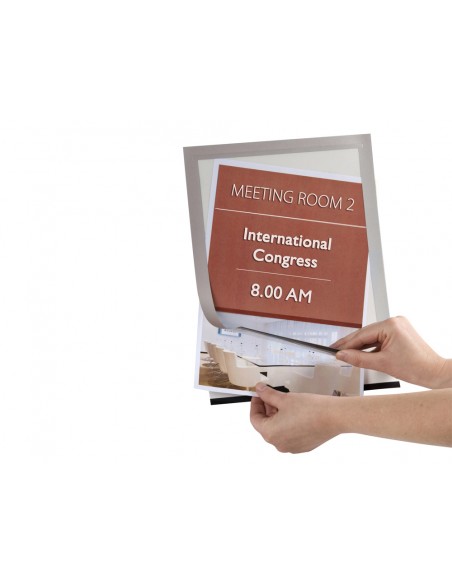 Marco portaanuncios con práctico sistema imantado para la introducción cómoda y rápida de documentos. Para fijar en superficies lisas gracias a su dorso adhesivo removible. Permite uso vertical y horizontal. Formato DIN A4. El pack de 2 marcos.