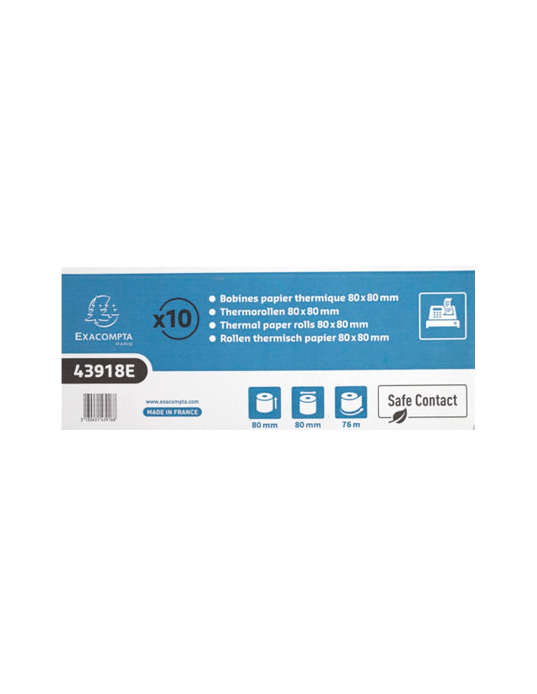 Rollo de sumadora Térmico Safe Contact. 80 mm ancho y diametro 80 mm (76 metros). Para cajas registradoras. Las bobinas Safe contact están fabricadas con un papel ligeramente azul grisáceo que no teme el calor, la luz o la humedad, lo que garantiza una impresión duradera (mínimo 35 años). Fabricadas sin revelados químico, sin BPA y sin Fenol, las bobinas Safe Contactson seguras para la salud e incluso están aprobadas para el contacto con alimentos. Este papel eco-responsable es reciclable con residuos de papel-Vida muy larga, certificado FSC con impresión en la parte posterior.
