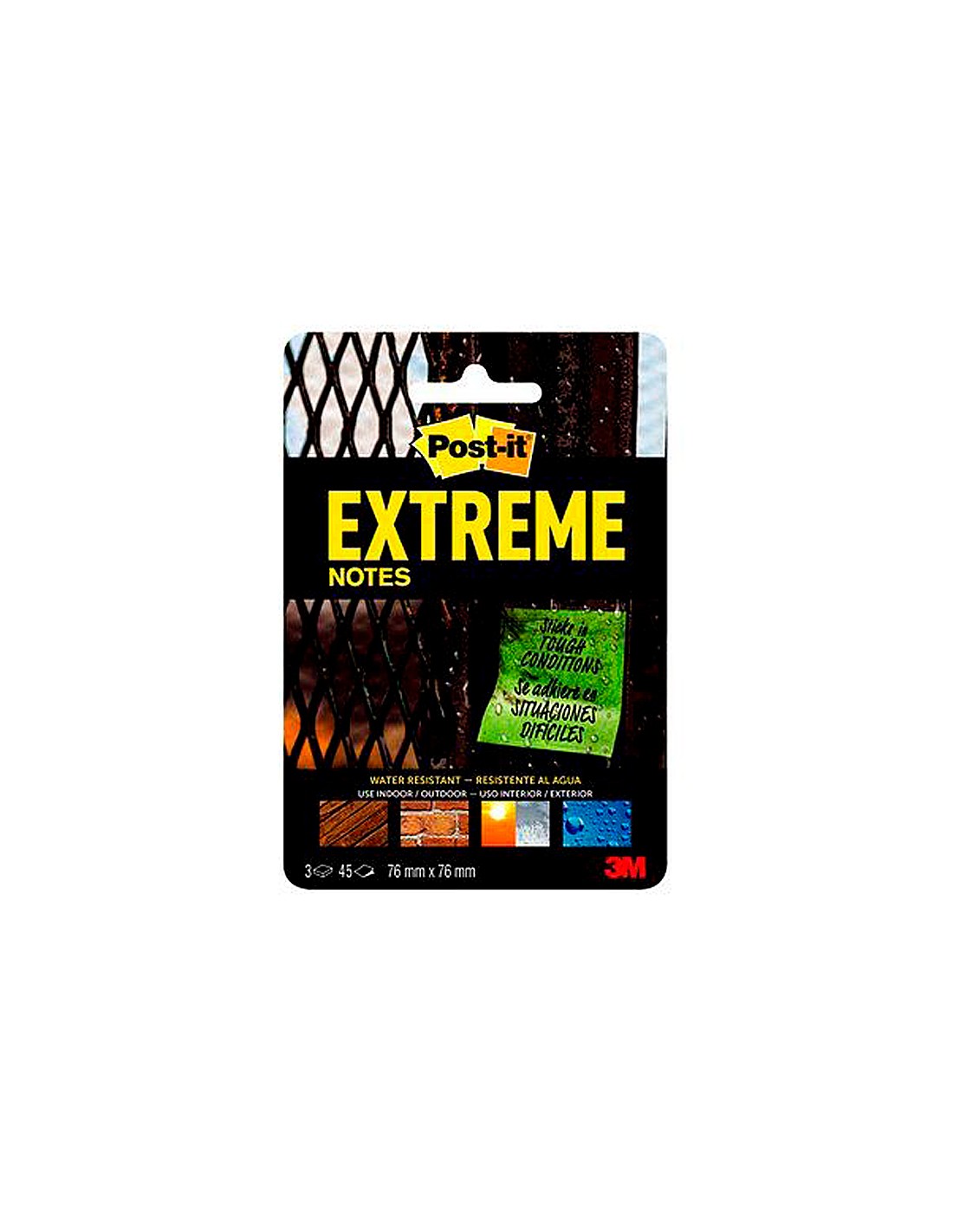 Bloc de notas adhesivas de quita y pon. Pega sobre superficies rugosas incluso en las condiciones más difíciles. Resistentes al agua. Se pueden usar en interior o exterior, en entornos fríos y cálidos. Colores amarillo, naranja y verde. Medidas 76 x 76 mm. 45 hojas.