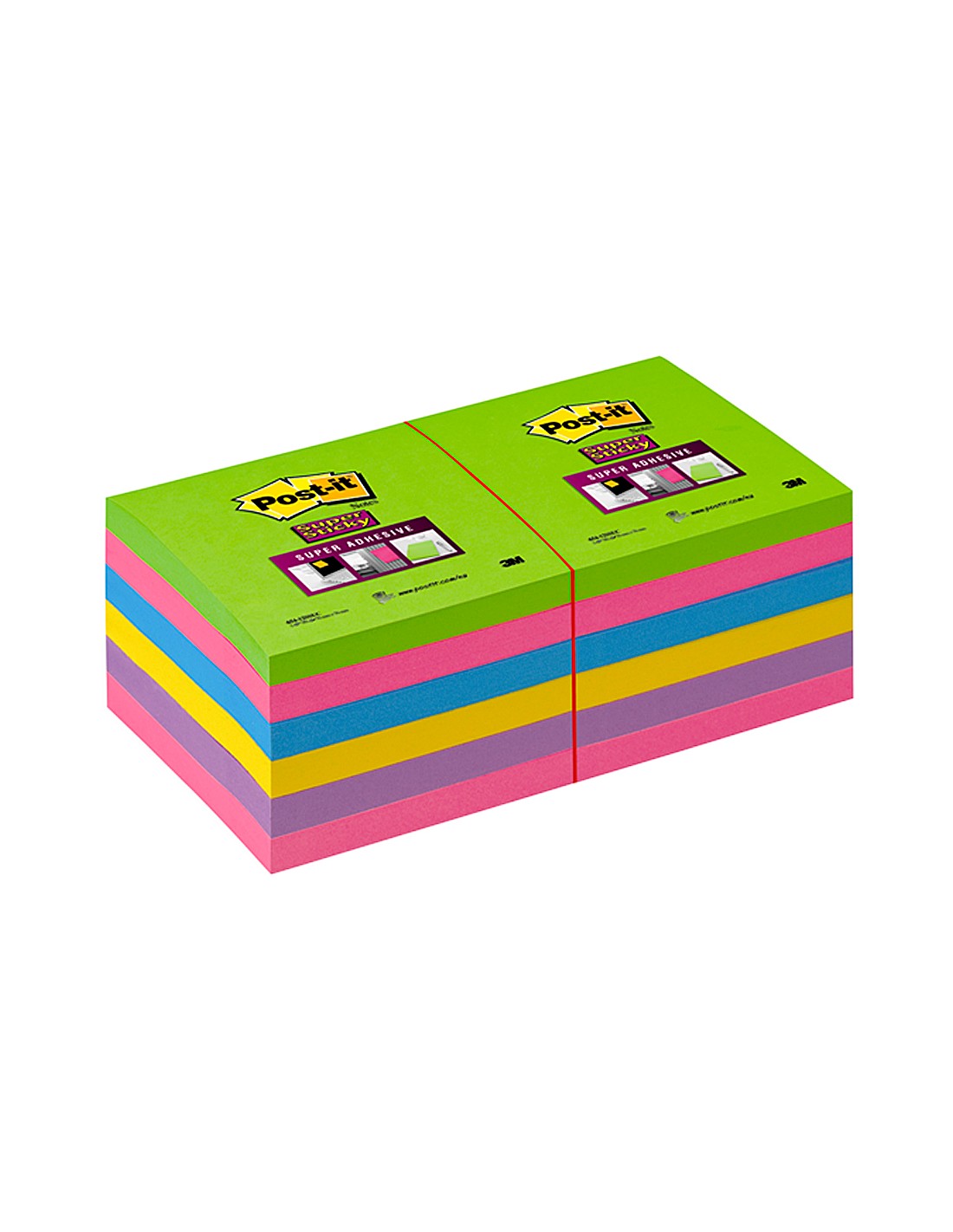 La nota que más pega. Superadhesiva. Especialmente indicada para superficies verticales, rugosas o de difícil adherencia. Colores amarillo, fucsia, celeste, naranja y morado. Medidas 76 x 76 mm. 90 hojas. El pack de 12 blocs.