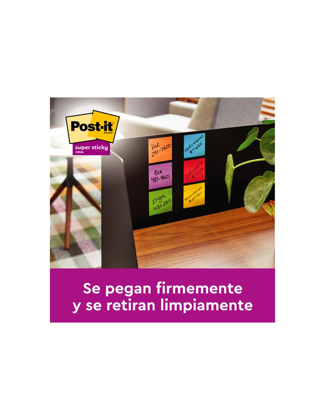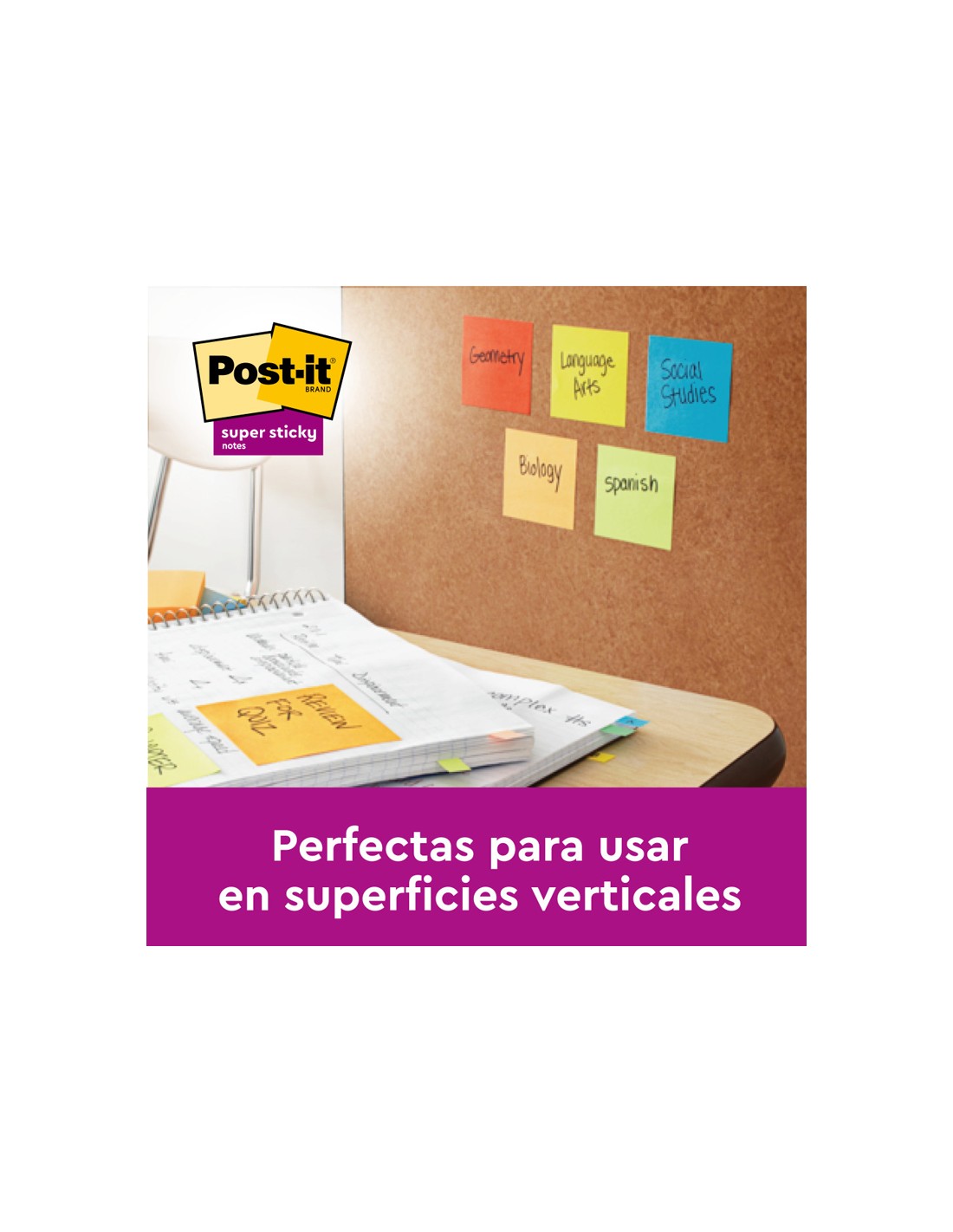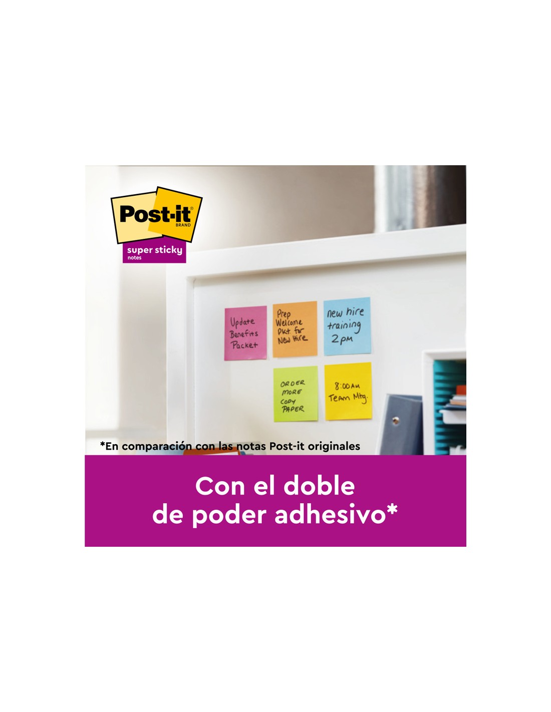 Las notas Post-it Super Sticky tienen el doble de poder de adherencia (quelas notas Post-it originales). Son superfuertes, superversátiles y están disponibles en colores suaves, brillantes o vibrantes para que la información destaque. Medidas 76x127 mm.
