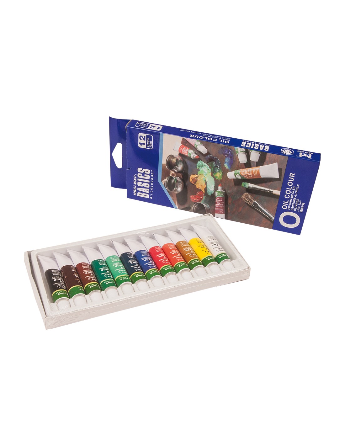 En caja de cartón. Pintar al óleo es cubrir con pintura al aceite una superficie de tela, madera, cartón, papel u otro material. 12 colores surtidos. Tubos de 12 ml.