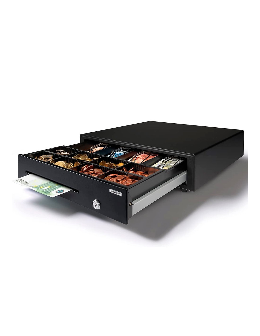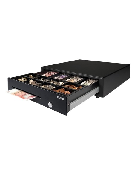 Robustos rodillos con cojinetes de bolas. Testado para al menos 1 millón de aperturas. Robustas pinzas de metal. Sencilla apertura por presión. Gaveta ajustable y extraíble. 4 compartimentos para billetes y 8 compartimentos para monedas. Compatible con cajas registradoras con conexión RJ12 (12V). Medidas 410 x 115 x 415 mm. Peso 6,6 kg.
