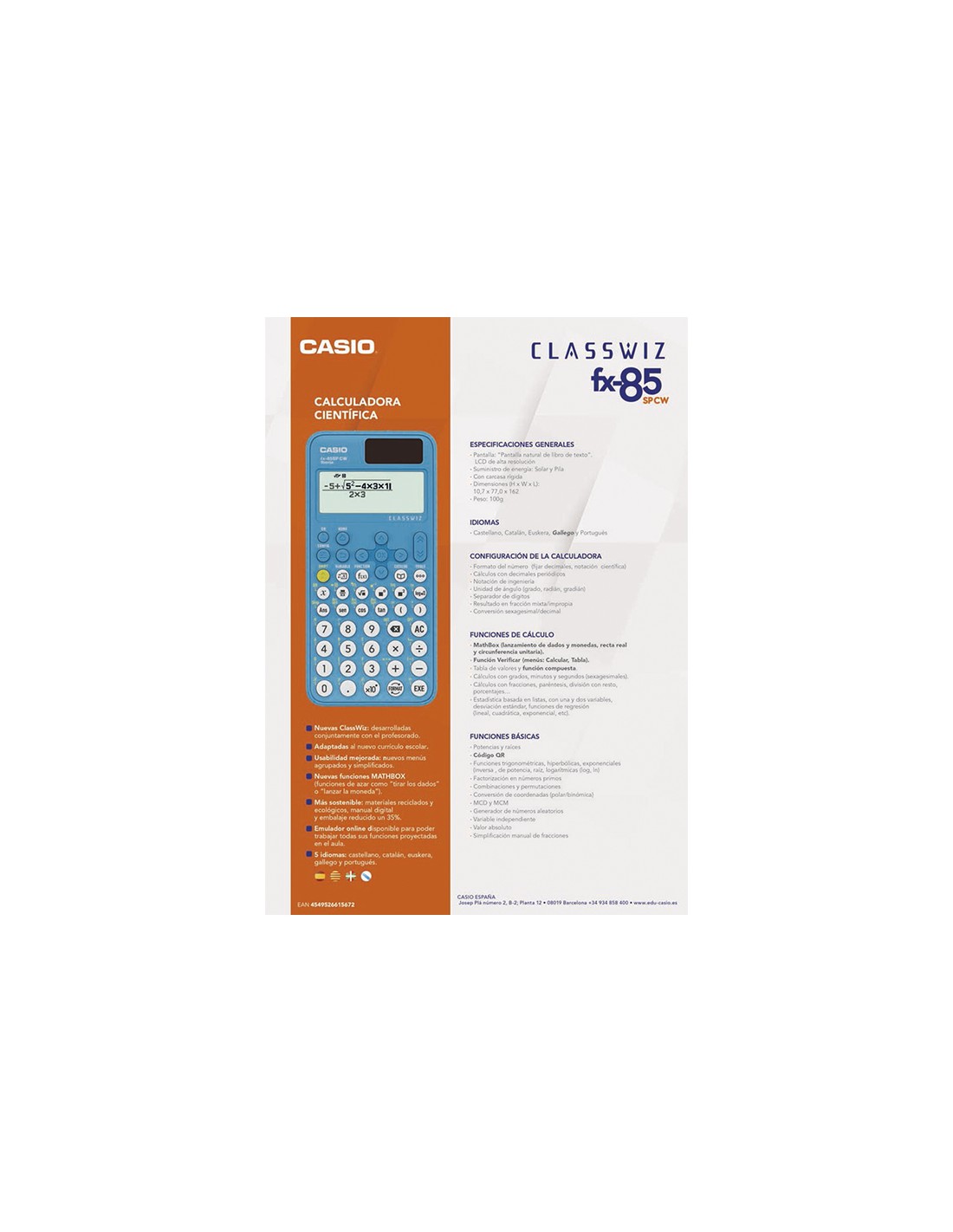 Calculadora Científica FX-85SP CW. Texto matemático natural. Pantalla LCD. +300 funciones, simplificación fracciones, cálculos fraccionarios, división entera, MCD, MCM, números primos. Con tapa. 6 líneas. 5 idiomas. Solar/Pila.